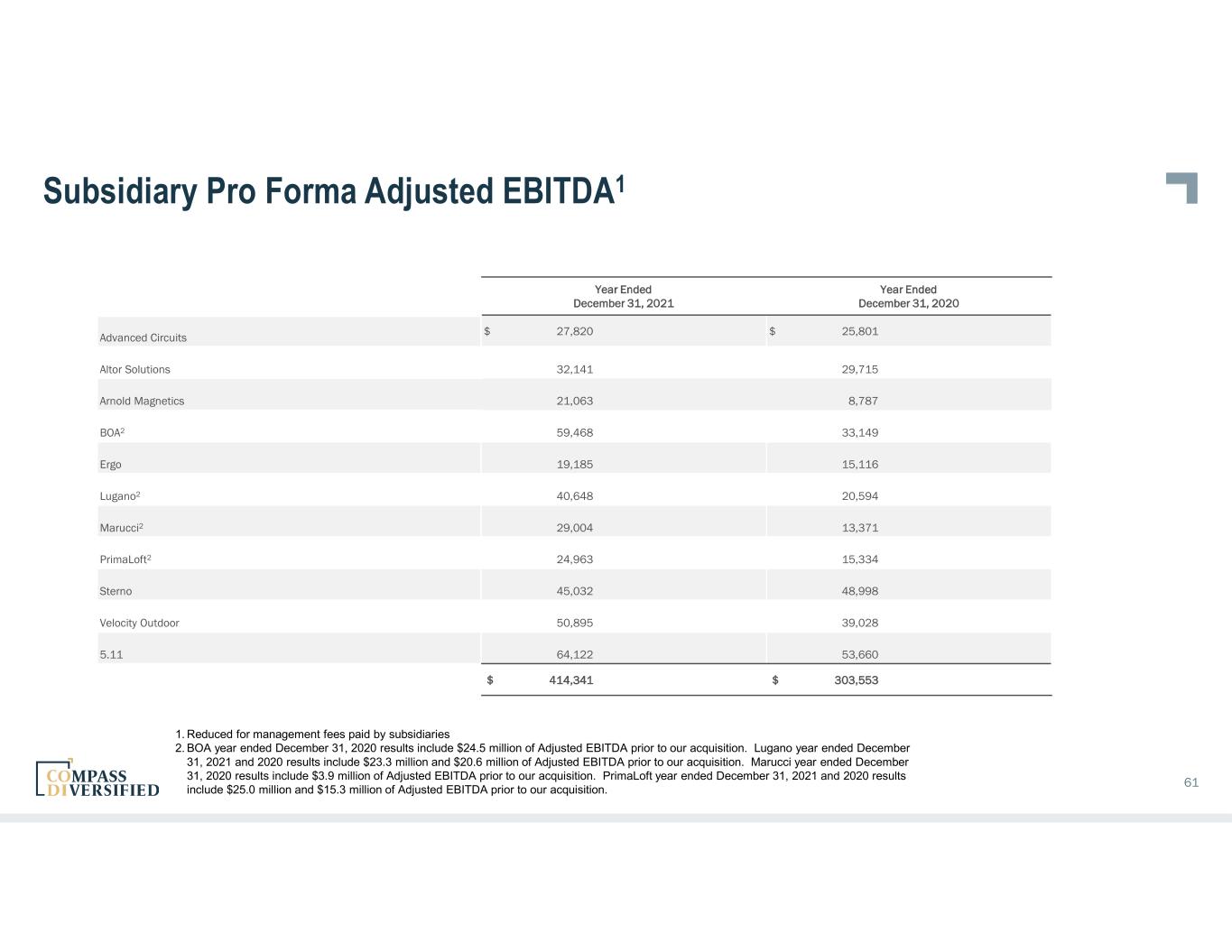 Subsidiary Pro Forma Adjusted EBITDA1 61 Year Ended December 31, 2021 Year Ended December 31, 2020 Advanced Circuits $ 27,820 $ 25,801 Altor Solutions 32,141 29,715 Arnold Magnetics 21,063 8,787 BOA2 59,468 33,149 Ergo 19,185 15,116 Lugano2 40,648 20,594 Marucci2 29,004 13,371 PrimaLoft2 24,963 15,334 Sterno 45,032 48,998 Velocity Outdoor 50,895 39,028 5.11 64,122 53,660 $ 414,341 $ 303,553 1. Reduced for management fees paid by subsidiaries 2. BOA year ended December 31, 2020 results include $24.5 million of Adjusted EBITDA prior to our acquisition. Lugano year ended December 31, 2021 and 2020 results include $23.3 million and $20.6 million of Adjusted EBITDA prior to our acquisition. Marucci year ended December 31, 2020 results include $3.9 million of Adjusted EBITDA prior to our acquisition. PrimaLoft year ended December 31, 2021 and 2020 results include $25.0 million and $15.3 million of Adjusted EBITDA prior to our acquisition.