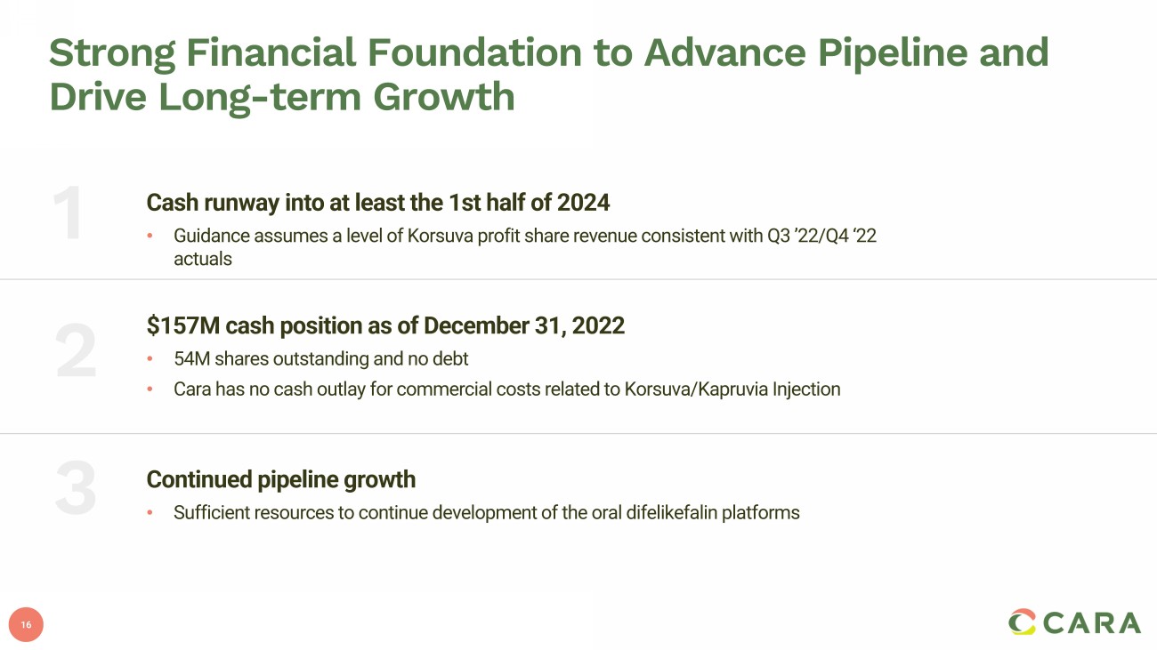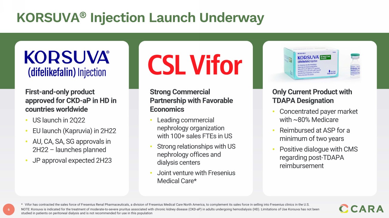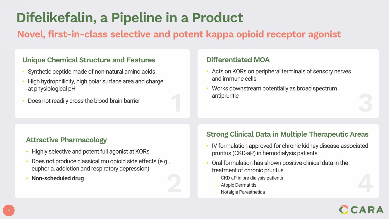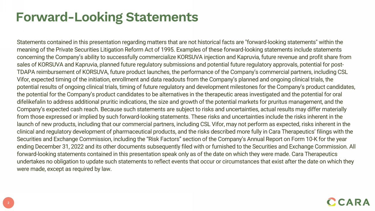 2 Forward - Looking Statements Statements contained in this presentation regarding matters that are not historical facts are "forward - looking statements" withi n the meaning of the Private Securities Litigation Reform Act of 1995. Examples of these forward - looking statements include statements concerning the Company’s ability to successfully commercialize KORSUVA injection and Kapruvia , future revenue and profit share from sales of KORSUVA and Kapruvia , planned future regulatory submissions and potential future regulatory approvals, potential for post - TDAPA reimbursement of KORSUVA, future product launches, the performance of the Company’s commercial partners, including CSL Vifor, expected timing of the initiation, enrollment and data readouts from the Company’s planned and ongoing clinical trials , t he potential results of ongoing clinical trials, timing of future regulatory and development milestones for the Company’s produc t c andidates, the potential for the Company’s product candidates to be alternatives in the therapeutic areas investigated and the potential fo r oral difelikefalin to address additional pruritic indications, the size and growth of the potential markets for pruritus management, and the Company’s expected cash reach. Because such statements are subject to risks and uncertainties, actual results may differ mate ria lly from those expressed or implied by such forward - looking statements. These risks and uncertainties include the risks inherent in the launch of new products, including that our commercial partners, including CSL Vifor, may not perform as expected, risks inher ent in the clinical and regulatory development of pharmaceutical products, and the risks described more fully in Cara Therapeutics’ fili ngs with the Securities and Exchange Commission, including the “Risk Factors” section of the Company’s Annual Report on Form 10 - K for the yea r ending December 31, 2022 and its other documents subsequently filed with or furnished to the Securities and Exchange Commissi on. All forward - looking statements contained in this presentation speak only as of the date on which they were made. Cara Therapeutics undertakes no obligation to update such statements to reflect events that occur or circumstances that exist after the date on wh ich they were made, except as required by law.