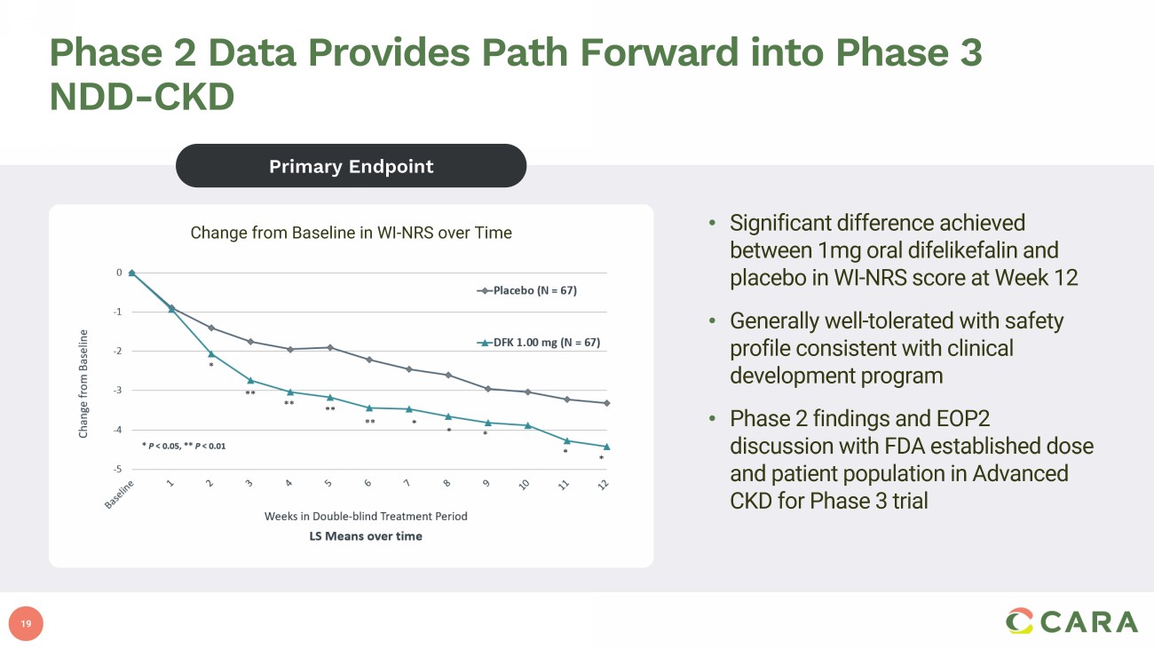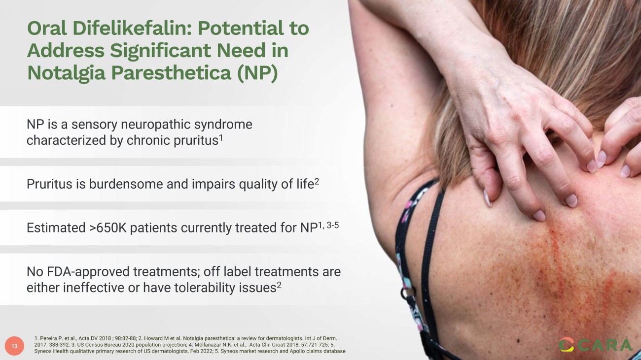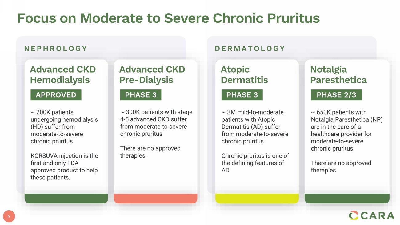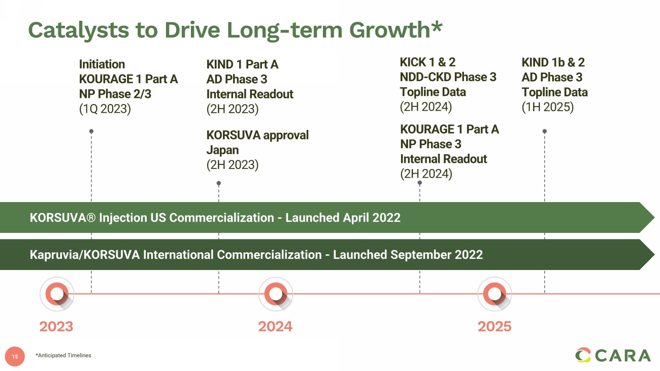 2 Forward - Looking Statements Statements contained in this presentation regarding matters that are not historical facts are "forward - looking statements" withi n the meaning of the Private Securities Litigation Reform Act of 1995. Examples of these forward - looking statements include statements concerning the Company’s ability to successfully commercialize KORSUVA injection and Kapruvia , future revenue and profit share from sales of KORSUVA and Kapruvia , planned future regulatory submissions and potential future regulatory approvals, potential for post - TDAPA reimbursement of KORSUVA, future product launches, the performance of the Company’s commercial partners, including CSL Vifor, expected timing of the initiation, enrollment and data readouts from the Company’s planned and ongoing clinical trials , t he potential results of ongoing clinical trials, timing of future regulatory and development milestones for the Company’s produc t c andidates, the potential for the Company’s product candidates to be alternatives in the therapeutic areas investigated and the potential fo r oral difelikefalin to address additional pruritic indications, the size and growth of the potential markets for pruritus management, and the Company’s expected cash reach. Because such statements are subject to risks and uncertainties, actual results may differ mate ria lly from those expressed or implied by such forward - looking statements. These risks and uncertainties include the risks inherent in the launch of new products, including that our commercial partners, including CSL Vifor, may not perform as expected, risks inher ent in the clinical and regulatory development of pharmaceutical products, and the risks described more fully in Cara Therapeutics’ fili ngs with the Securities and Exchange Commission, including the “Risk Factors” section of the Company’s Annual Report on Form 10 - K for the yea r ending December 31, 2022 and its other documents subsequently filed with or furnished to the Securities and Exchange Commissi on. All forward - looking statements contained in this presentation speak only as of the date on which they were made. Cara Therapeutics undertakes no obligation to update such statements to reflect events that occur or circumstances that exist after the date on wh ich they were made, except as required by law.
