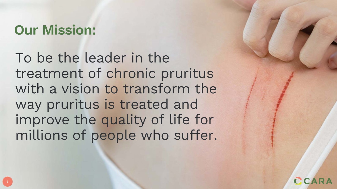 3 Our Mission: To be the leader in the treatment of chronic pruritus with a vision to transform the way pruritus is treated and improve the life for millions of people who suffer. 3