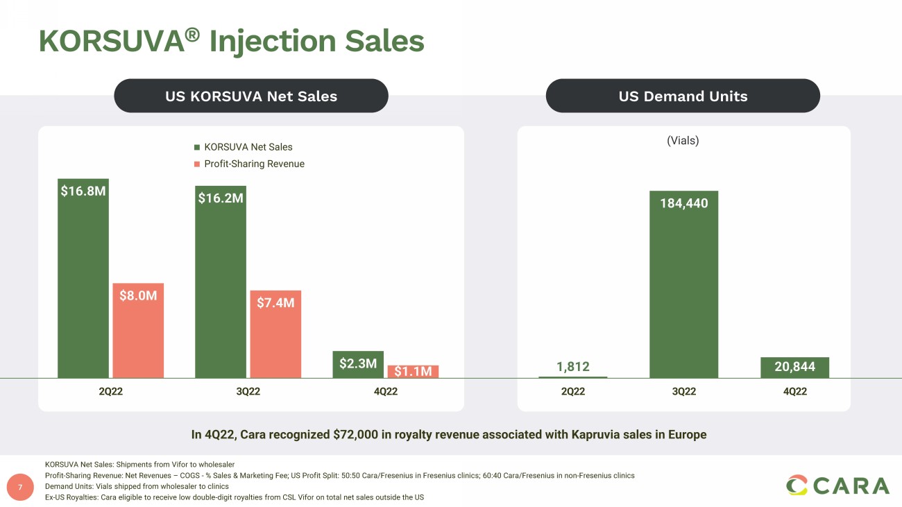7 KORSUVA ® Injection Sales KORSUVA Net Sales: Shipments from Vifor to wholesaler Profit - Sharing Revenue: Net Revenues – COGS - % Sales & Marketing Fee; US Profit Split: 50:50 Cara/Fresenius in Fresenius clinic s; 60:40 Cara/Fresenius in non - Fresenius clinics Demand Units: Vials shipped from wholesaler to clinics Ex - US Royalties: Cara eligible to receive low double - digit royalties from CSL Vifor on total net sales outside the US US KORSUVA Net Sales US Demand Units $16.8M $16.2M $2.3M $8.0M $7.4M $1.1M 2Q22 3Q22 4Q22 KORSUVA Net Sales Profit-Sharing Revenue 1,812 184,440 20,844 2Q22 3Q22 4Q22 (Vials) In 4Q22, Cara recognized $72,000 in royalty revenue associated with Kapruvia sales in Europe