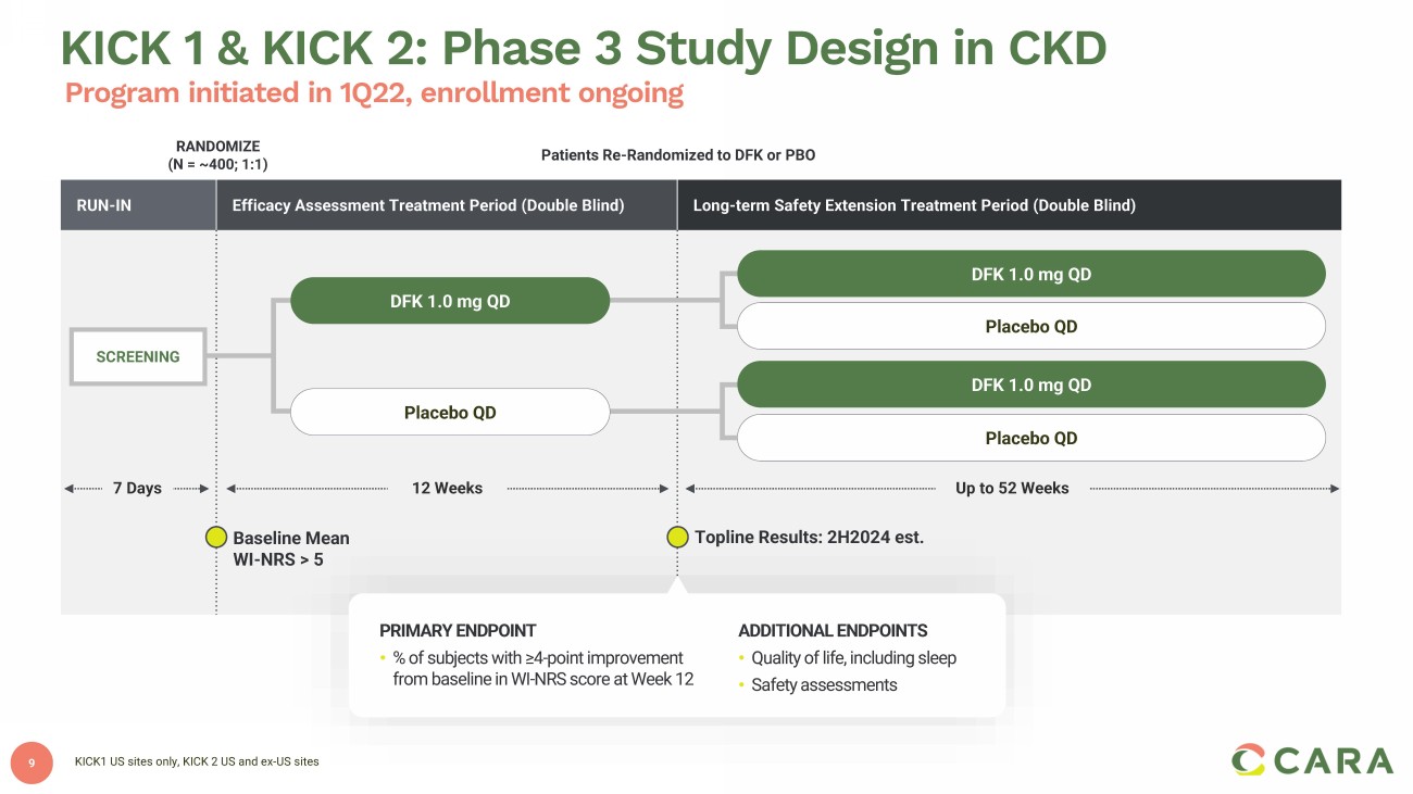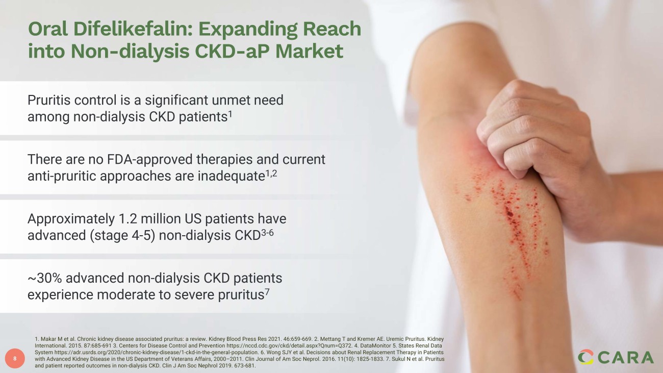 8 Pruritis control is a significant unmet need among non - dialysis CKD patients 1 There are no FDA - approved therapies and current anti - pruritic approaches are inadequate 1,2 Approximately 1.2 million US patients have advanced (stage 4 - 5) non - dialysis CKD 3 - 6 ~30% advanced non - dialysis CKD patients experience moderate to severe pruritus 7 Oral Difelikefalin : Expanding Reach into Non - dialysis CKD - aP Market 1. Makar M et al. Chronic kidney disease associated pruritus: a review. Kidney Blood Press Res 2021. 46:659 - 669. 2. Mettang T and Kremer AE. Uremic Pruritus. Kidney International. 2015. 87:685 - 691 3. Centers for Disease Control and Prevention https://nccd.cdc.gov/ckd/detail.aspx?Qnum=Q372. 4. DataMonitor 5. States Renal Data System https://adr.usrds.org/2020/chronic - kidney - disease/1 - ckd - in - the - general - population. 6. Wong SJY et al. Decisions about Ren al Replacement Therapy in Patients with Advanced Kidney Disease in the US Department of Veterans Affairs, 2000 – 2011. Clin Journal of Am Soc Neprol. 2016. 11(10): 1 825 - 1833. 7. Sukul N et al. Pruritus and patient reported outcomes in non - dialysis CKD. Clin J Am Soc Nephrol 2019. 673 - 681. 8
