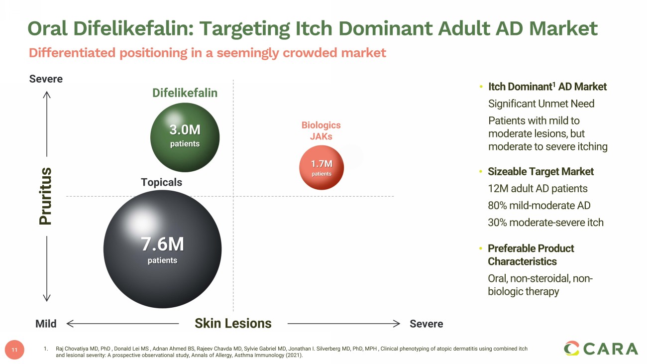 10 Oral Difelikefalin : Potential to Address Significant Need for an Oral Antipruritic in Atopic Dermatitis (AD) 1. Correale CE et al. Atopic dermatitis: a review of diagnosis and treatment. Am Fam Physician. 1999. 60(4):1191 - 1198 2. Silverberg JI et a l. Patient burden and quality of life in atopic dermatitis in US adults. Annals of Allergy, Asthma, and Immunology (2018). 121(3): 340 - 347 3. Legat FJ. Itch in atopic dermatitis – what is new? Front Med (Lausanne) 2021. 8:644760. 4. Barbarot S, Auziere S, Gadkari A, et al. Epidemiology of atopic dermatitis in adults: results from an international survey. Allergy. 2018;73(6):1284 - 1293. 5. United States Census Bureau 2020 . 6. Raj Chovatiya MD, PhD , Donald Lei MS , Adnan Ahmed BS, Rajeev Chavda MD, Sylvie Gabriel MD, Jonathan I. Silverberg MD, PhD, MPH , Clinical phenotyping of atopic dermatitis using combined itch and lesional severity: A prospective observational study, Annals of Allergy, Asthma Immunology (2021). Pruritus is a hallmark of AD, often called “the itch that rashes” 1 Itch is considered the most burdensome AD symptom by patients 2 , strongly and negatively impacts quality of life 3 Target “itch dominant” adult AD patients (~25% of market or ~3M) with moderate to severe pruritus, but mild to moderate disease 4 - 6 Pruritus in AD remains an unmet need 10