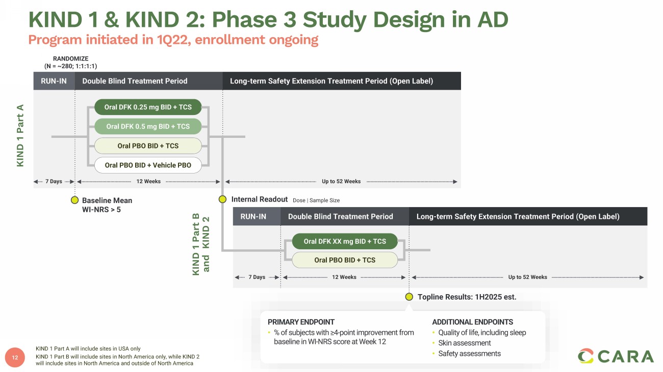 11 Oral Difelikefalin: Targeting Itch Dominant Adult AD Market Differentiated positioning in a seemingly crowded market • Sizeable Target Market 12M adult AD patients 80% mild - moderate AD 30% moderate - severe itch • Itch Dominant 1 AD Market Significant Unmet Need Patients with mild to moderate lesions, but moderate to severe itching • Preferable Product Characteristics Oral, non - steroidal, non - biologic therapy Severe Mild Severe 3.0M patients 1.7M patients Biologics JAKs Skin Lesions Pruritus 7.6M patients Topicals Difelikefalin 1. Raj Chovatiya MD, PhD , Donald Lei MS , Adnan Ahmed BS, Rajeev Chavda MD, Sylvie Gabriel MD, Jonathan I. Silverberg MD, PhD, MPH , Clinical phenotyping of atopic dermatitis using combined itch and lesional severity: A prospective observational study, Annals of Allergy, Asthma Immunology (2021).