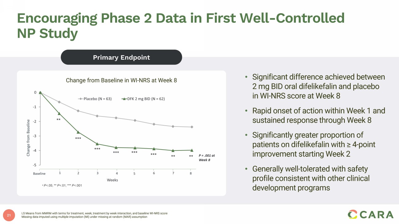 20 Population: Mild to Moderate AD (BSA <10) KARE STUDY: Phase 2 Data in Atopic Dermatitis (AD) • A nti - pruritic effect started at week 1 and was sustained through week 12 • Statistical significance achieved for the registration endpoint (4 - point responder) in mild - to - moderate AD population • The drug was generally well tolerated 4 - point Responder Analysis at Week 12 (% of Subjects) N = 79 N = 178 Placebo Difelikefalin P=0.033 19% 32%* All doses (0.25mg, 0.50 mg , 1.0mg) performed similarly versus PBO