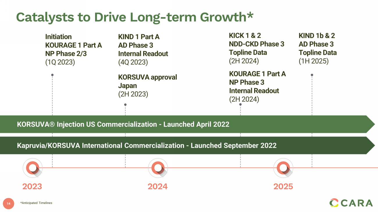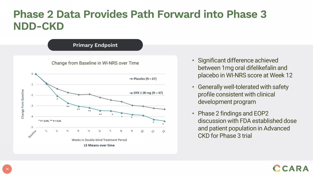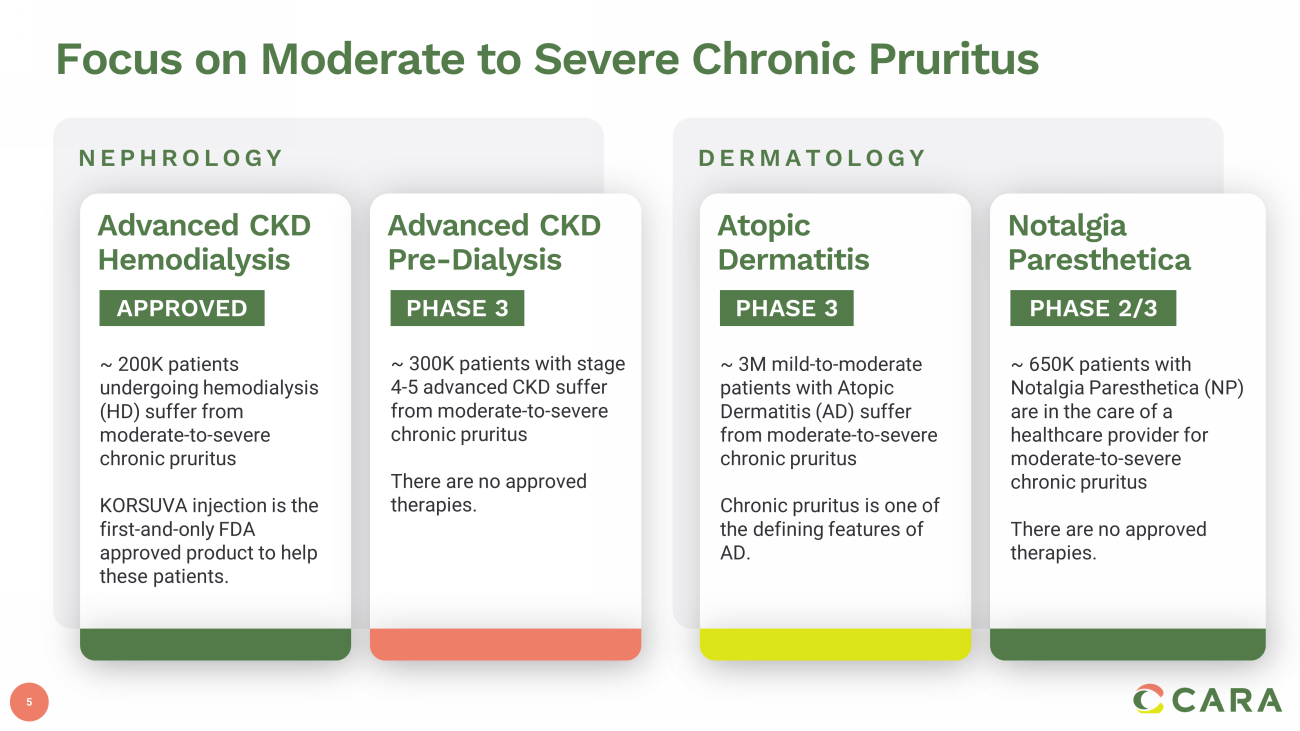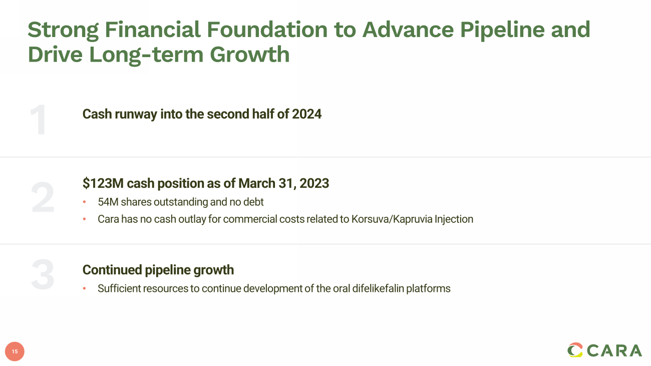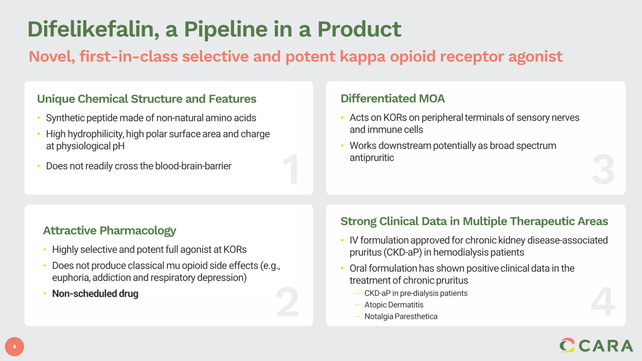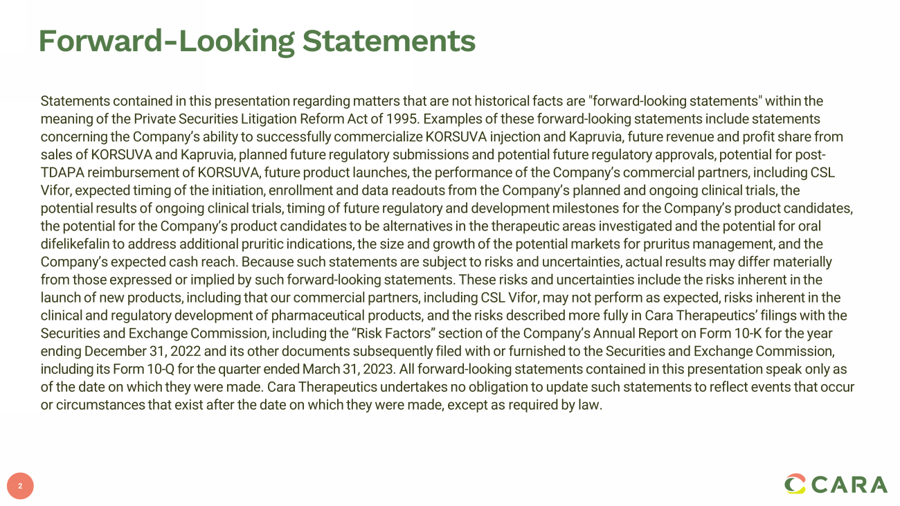 2 Forward - Looking Statements Statements contained in this presentation regarding matters that are not historical facts are "forward - looking statements" withi n the meaning of the Private Securities Litigation Reform Act of 1995. Examples of these forward - looking statements include statements concerning the Company’s ability to successfully commercialize KORSUVA injection and Kapruvia , future revenue and profit share from sales of KORSUVA and Kapruvia , planned future regulatory submissions and potential future regulatory approvals, potential for post - TDAPA reimbursement of KORSUVA, future product launches, the performance of the Company’s commercial partners, including CSL Vifor, expected timing of the initiation, enrollment and data readouts from the Company’s planned and ongoing clinical trials , t he potential results of ongoing clinical trials, timing of future regulatory and development milestones for the Company’s produc t c andidates, the potential for the Company’s product candidates to be alternatives in the therapeutic areas investigated and the potential fo r oral difelikefalin to address additional pruritic indications, the size and growth of the potential markets for pruritus management, and the Company’s expected cash reach. Because such statements are subject to risks and uncertainties, actual results may differ mate ria lly from those expressed or implied by such forward - looking statements. These risks and uncertainties include the risks inherent in the launch of new products, including that our commercial partners, including CSL Vifor, may not perform as expected, risks inher ent in the clinical and regulatory development of pharmaceutical products, and the risks described more fully in Cara Therapeutics’ fili ngs with the Securities and Exchange Commission, including the “Risk Factors” section of the Company’s Annual Report on Form 10 - K for the yea r ending December 31, 2022 and its other documents subsequently filed with or furnished to the Securities and Exchange Commissi on , including its Form 10 - Q for the quarter ended March 31, 2023 . All forward - looking statements contained in this presentation speak only as of the date on which they were made. Cara Therapeutics undertakes no obligation to update such statements to reflect events t hat occur or circumstances that exist after the date on which they were made, except as required by law.