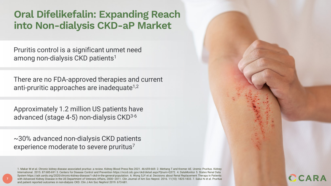7 Pruritis control is a significant unmet need among non - dialysis CKD patients 1 There are no FDA - approved therapies and current anti - pruritic approaches are inadequate 1,2 Approximately 1.2 million US patients have advanced (stage 4 - 5) non - dialysis CKD 3 - 6 ~30% advanced non - dialysis CKD patients experience moderate to severe pruritus 7 Oral Difelikefalin : Expanding Reach into Non - dialysis CKD - aP Market 1. Makar M et al. Chronic kidney disease associated pruritus: a review. Kidney Blood Press Res 2021. 46:659 - 669. 2. Mettang T and Kremer AE. Uremic Pruritus. Kidney International. 2015. 87:685 - 691 3. Centers for Disease Control and Prevention https://nccd.cdc.gov/ckd/detail.aspx?Qnum=Q372. 4. DataMonitor 5. States Renal Data System https://adr.usrds.org/2020/chronic - kidney - disease/1 - ckd - in - the - general - population. 6. Wong SJY et al. Decisions about Ren al Replacement Therapy in Patients with Advanced Kidney Disease in the US Department of Veterans Affairs, 2000 – 2011. Clin Journal of Am Soc Neprol. 2016. 11(10): 1 825 - 1833. 7. Sukul N et al. Pruritus and patient reported outcomes in non - dialysis CKD. Clin J Am Soc Nephrol 2019. 673 - 681. 7