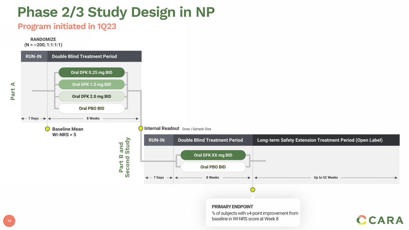 12 NP is a sensory neuropathic syndrome characterized by chronic pruritus 1 Pruritus is burdensome and impairs quality of life 2 Estimated >650K patients currently treated for NP 1, 3 - 5 No FDA - approved treatments; off label treatments are either ineffective or have tolerability issues 2 Oral Difelikefalin : Potential to Address Significant Need in Notalgia Paresthetica (NP) 1. Pereira P. et al., Acta DV 2018 ; 98:82 - 88; 2. Howard M et al. Notalgia paresthetica: a review for dermatologists. Int J of Derm . 2017. 388 - 392. 3. US Census Bureau 2020 population projection; 4. Mollanazar N.K. et al., Acta Clin Croat 2018; 57:721 - 725 ; 5. Syneos Health qualitative primary research of US dermatologists, Feb 2022; 5. Syneos market research and Apollo claims database 12