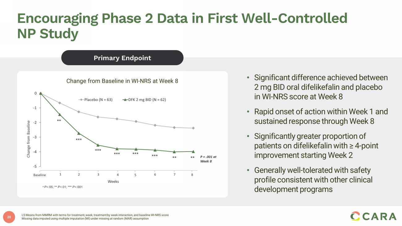 20 Primary Endpoint Change from Baseline in WI - NRS at Week 8 Encouraging Phase 2 Data in First Well - Controlled NP Study • Significant difference achieved between 2 mg BID oral difelikefalin and placebo in WI - NRS score at Week 8 • Rapid onset of action within Week 1 and sustained response through Week 8 • Significantly greater proportion of patients on difelikefalin with ≥ 4 - point improvement starting Week 2 • Generally well - tolerated with safety profile consistent with other clinical development programs LS Means from MMRM with terms for treatment, week, treatment by week interaction, and baseline WI - NRS score Missing data imputed using multiple imputation (MI) under missing at random (MAR) assumption