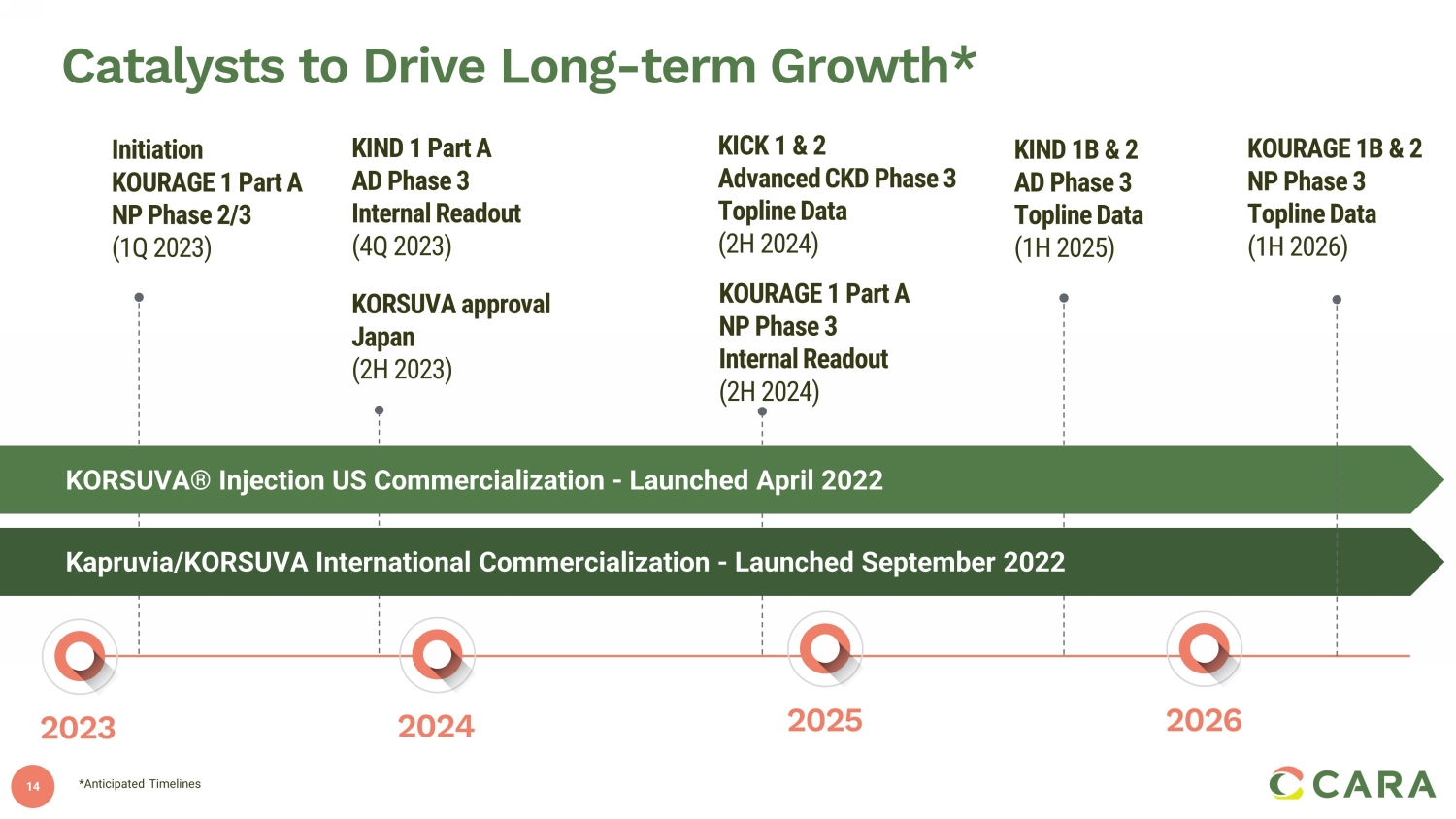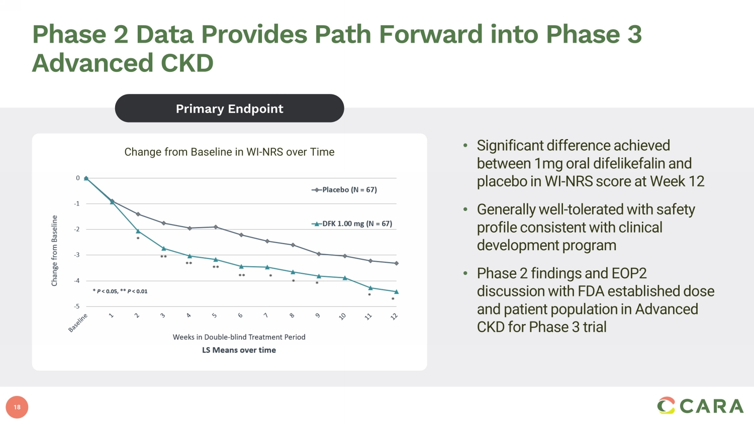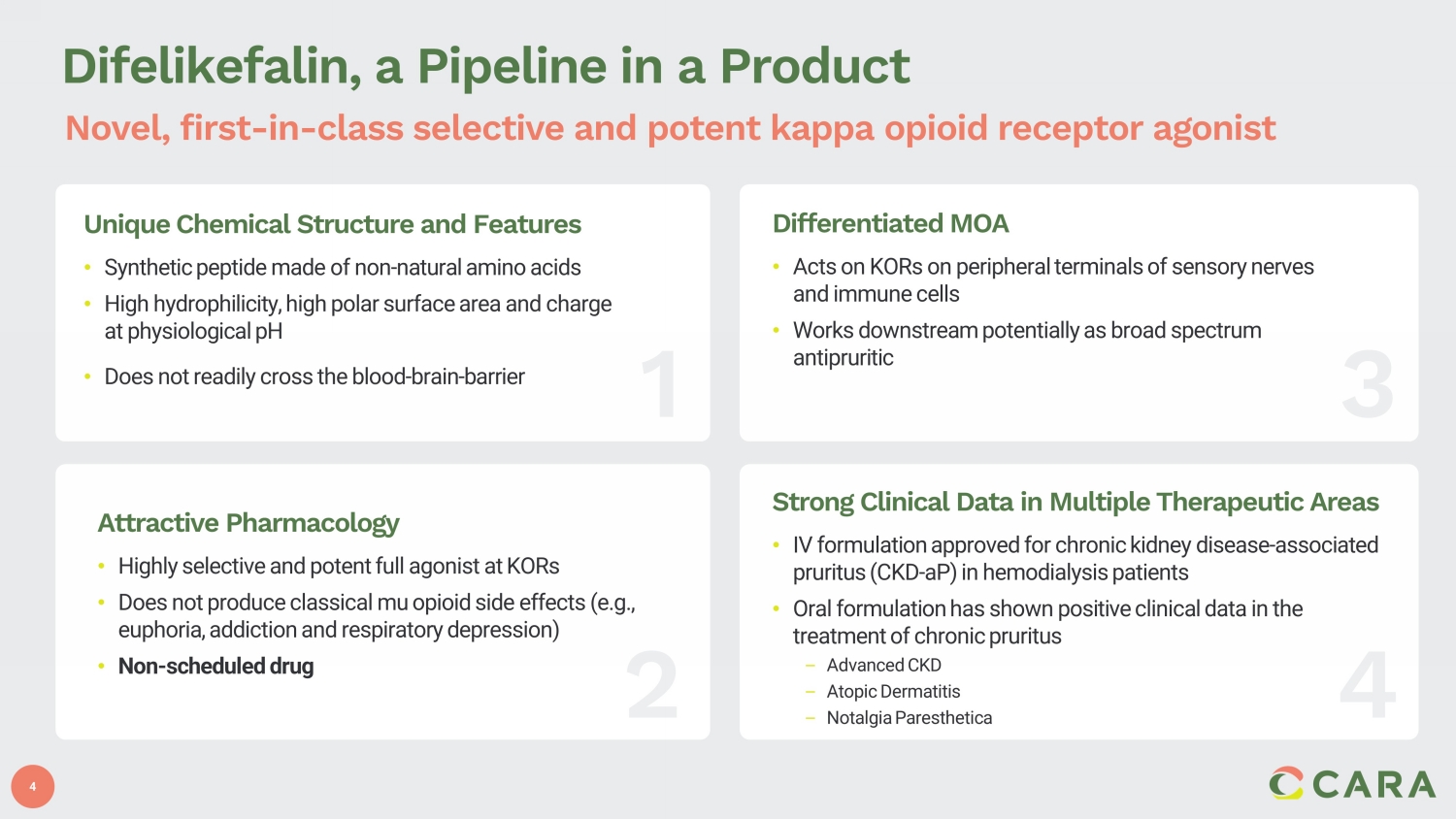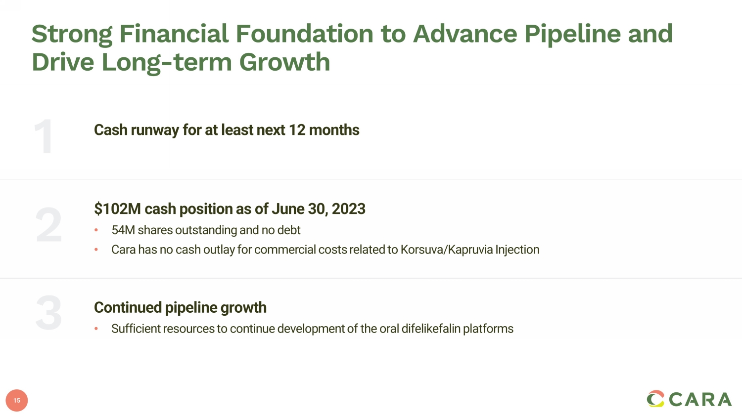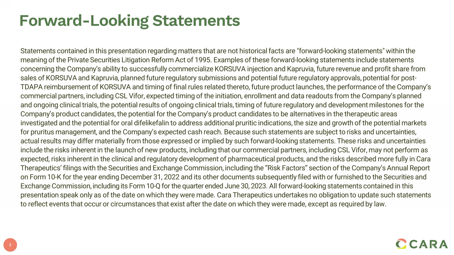 2 Forward - Looking Statements Statements contained in this presentation regarding matters that are not historical facts are "forward - looking statements" withi n the meaning of the Private Securities Litigation Reform Act of 1995. Examples of these forward - looking statements include statements concerning the Company’s ability to successfully commercialize KORSUVA injection and Kapruvia , future revenue and profit share from sales of KORSUVA and Kapruvia , planned future regulatory submissions and potential future regulatory approvals, potential for post - TDAPA reimbursement of KORSUVA and timing of final rules related thereto, future product launches, the performance of the Com pan y’s commercial partners, including CSL Vifor, expected timing of the initiation, enrollment and data readouts from the Company’s pla nned and ongoing clinical trials, the potential results of ongoing clinical trials, timing of future regulatory and development mi les tones for the Company’s product candidates, the potential for the Company’s product candidates to be alternatives in the therapeutic areas investigated and the potential for oral difelikefalin to address additional pruritic indications, the size and growth of the potential markets for pruritus management, and the Company’s expected cash reach. Because such statements are subject to risks and uncertaintie s, actual results may differ materially from those expressed or implied by such forward - looking statements. These risks and uncerta inties include the risks inherent in the launch of new products, including that our commercial partners, including CSL Vifor, may no t p erform as expected, risks inherent in the clinical and regulatory development of pharmaceutical products, and the risks described more ful ly in Cara Therapeutics’ filings with the Securities and Exchange Commission, including the “Risk Factors” section of the Company’s Annu al Report on Form 10 - K for the year ending December 31, 2022 and its other documents subsequently filed with or furnished to the Securitie s and Exchange Commission , including its Form 10 - Q for the quarter ended June 30, 2023 . All forward - looking statements contained in this presentation speak only as of the date on which they were made. Cara Therapeutics undertakes no obligation to update such sta tem ents to reflect events that occur or circumstances that exist after the date on which they were made, except as required by law.