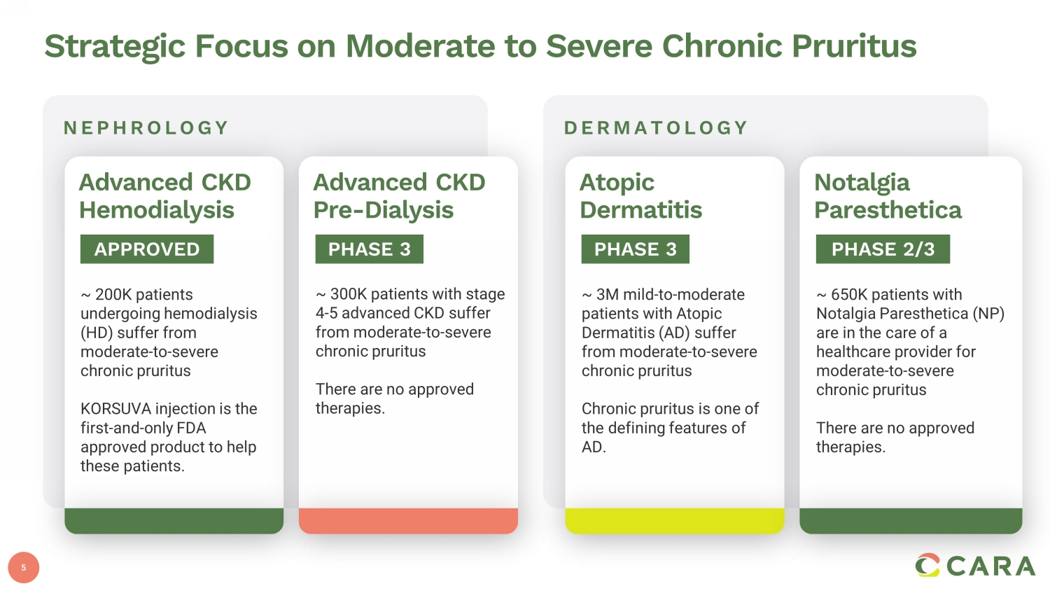 4 Difelikefalin, a Pipeline in a Product Novel, first - in - class selective and potent kappa opioid receptor agonist Unique Chemical Structure and Features • Synthetic peptide made of non - natural amino acids • High hydrophilicity, high polar surface area and charge at physiological pH • Does not readily cross the blood - brain - barrier Differentiated MOA • Acts on KORs on peripheral terminals of sensory nerves and immune cells • Works downstream potentially as broad spectrum antipruritic Attractive Pharmacology • Highly selective and potent full agonist at KORs • Does not produce classical mu opioid side effects (e.g., euphoria, addiction and respiratory depression) • Non - scheduled drug Strong Clinical Data in Multiple Therapeutic Areas • IV formulation approved for chronic kidney disease - associated pruritus (CKD - aP ) in hemodialysis patients • Oral formulation has shown positive clinical data in the treatment of chronic pruritus – Advanced CKD – Atopic Dermatitis – Notalgia Paresthetica