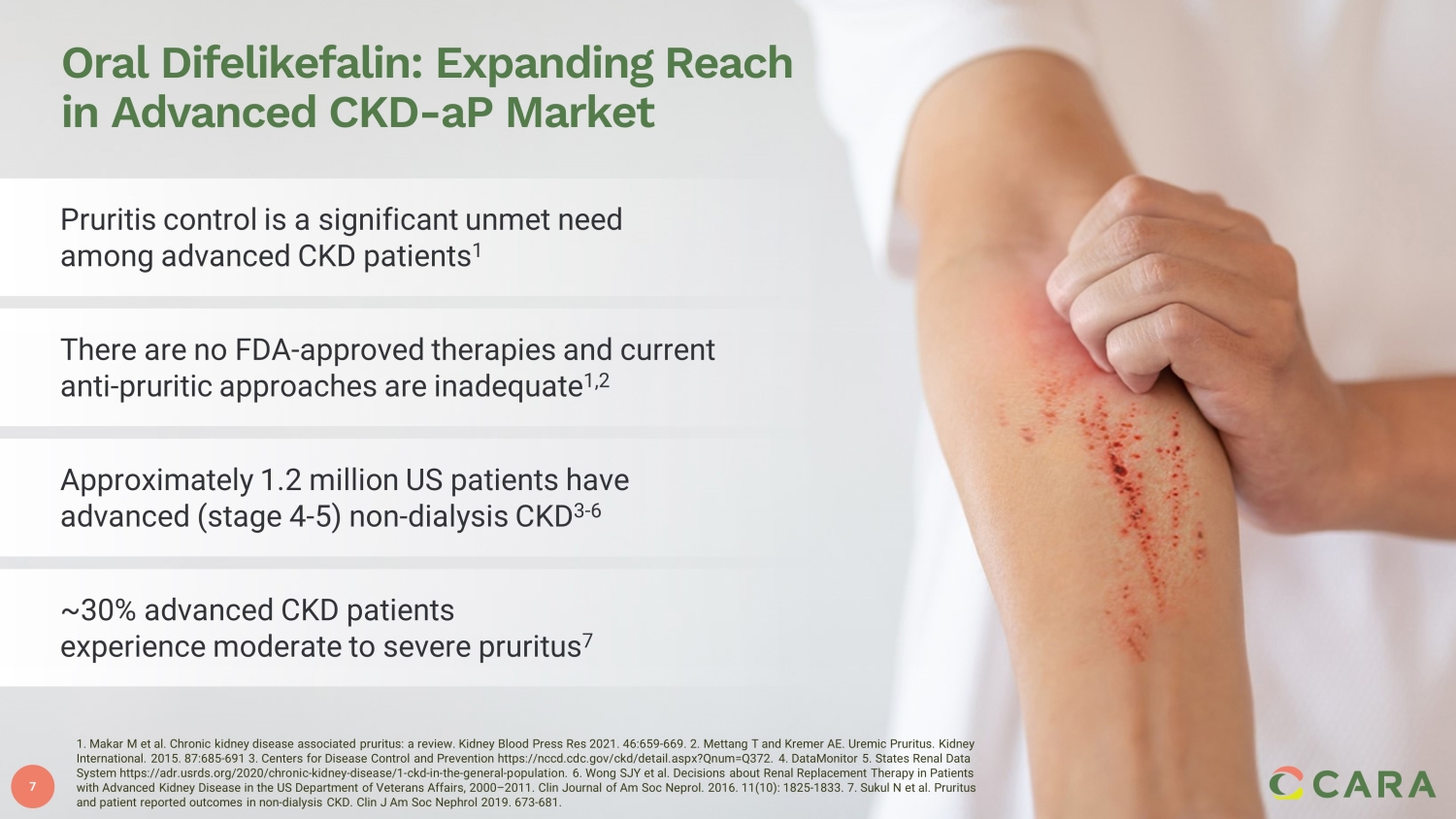 7 Pruritis control is a significant unmet need among advanced CKD patients 1 There are no FDA - approved therapies and current anti - pruritic approaches are inadequate 1,2 Approximately 1.2 million US patients have advanced (stage 4 - 5) non - dialysis CKD 3 - 6 ~30% advanced CKD patients experience moderate to severe pruritus 7 Oral Difelikefalin : Expanding Reach in Advanced CKD - aP Market 1. Makar M et al. Chronic kidney disease associated pruritus: a review. Kidney Blood Press Res 2021. 46:659 - 669. 2. Mettang T and Kremer AE. Uremic Pruritus. Kidney International. 2015. 87:685 - 691 3. Centers for Disease Control and Prevention https://nccd.cdc.gov/ckd/detail.aspx?Qnum=Q372. 4. DataMonitor 5. States Renal Data System https://adr.usrds.org/2020/chronic - kidney - disease/1 - ckd - in - the - general - population. 6. Wong SJY et al. Decisions about Ren al Replacement Therapy in Patients with Advanced Kidney Disease in the US Department of Veterans Affairs, 2000 – 2011. Clin Journal of Am Soc Neprol. 2016. 11(10): 1 825 - 1833. 7. Sukul N et al. Pruritus and patient reported outcomes in non - dialysis CKD. Clin J Am Soc Nephrol 2019. 673 - 681. 7