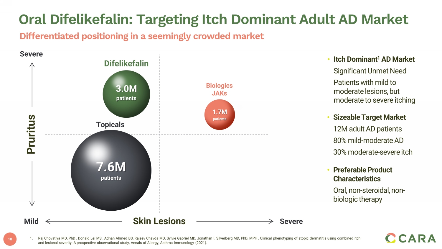 9 Oral Difelikefalin : Potential to Address Significant Need for an Oral Antipruritic in Atopic Dermatitis (AD) 1. Correale CE et al. Atopic dermatitis: a review of diagnosis and treatment. Am Fam Physician. 1999. 60(4):1191 - 1198 2. Silverberg JI et a l. Patient burden and quality of life in atopic dermatitis in US adults. Annals of Allergy, Asthma, and Immunology (2018). 121(3): 340 - 347 3. Legat FJ. Itch in atopic dermatitis – what is new? Front Med (Lausanne) 2021. 8:644760. 4. Barbarot S, Auziere S, Gadkari A, et al. Epidemiology of atopic dermatitis in adults: results from an international survey. Allergy. 2018;73(6):1284 - 1293. 5. United States Census Bureau 2020 . 6. Raj Chovatiya MD, PhD , Donald Lei MS , Adnan Ahmed BS, Rajeev Chavda MD, Sylvie Gabriel MD, Jonathan I. Silverberg MD, PhD, MPH , Clinical phenotyping of atopic dermatitis using combined itch and lesional severity: A prospective observational study, Annals of Allergy, Asthma Immunology (2021). Pruritus is a hallmark of AD, often called “the itch that rashes” 1 Itch is considered the most burdensome AD symptom by patients 2 , strongly and negatively impacts quality of life 3 Target “itch dominant” adult AD patients (~25% of market or ~3M) with moderate to severe pruritus, but mild to moderate disease 4 - 6 Pruritus in AD remains an unmet need 9
