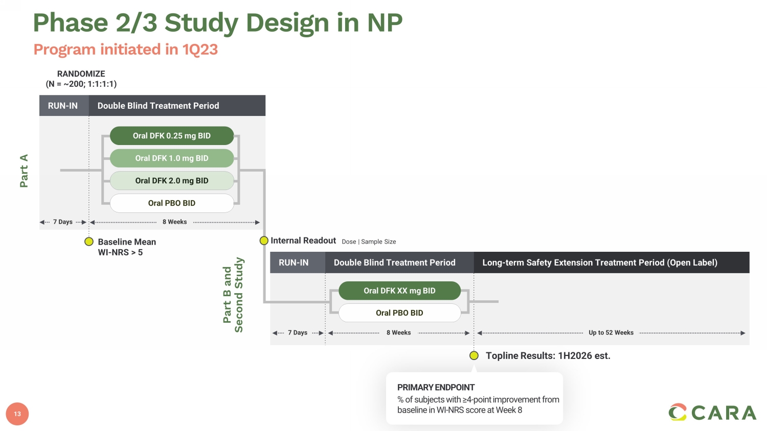 12 NP is a sensory neuropathic syndrome characterized by chronic pruritus 1 Pruritus is burdensome and impairs quality of life 2 Estimated >650K patients currently treated for NP 1, 3 - 5 No FDA - approved treatments; off label treatments are either ineffective or have tolerability issues 2 Oral Difelikefalin : Potential to Address Significant Need in Notalgia Paresthetica (NP) 1. Pereira P. et al., Acta DV 2018 ; 98:82 - 88; 2. Howard M et al. Notalgia paresthetica: a review for dermatologists. Int J of Derm . 2017. 388 - 392. 3. US Census Bureau 2020 population projection; 4. Mollanazar N.K. et al., Acta Clin Croat 2018; 57:721 - 725 ; 5. Syneos Health qualitative primary research of US dermatologists, Feb 2022; 5. Syneos market research and Apollo claims database 12