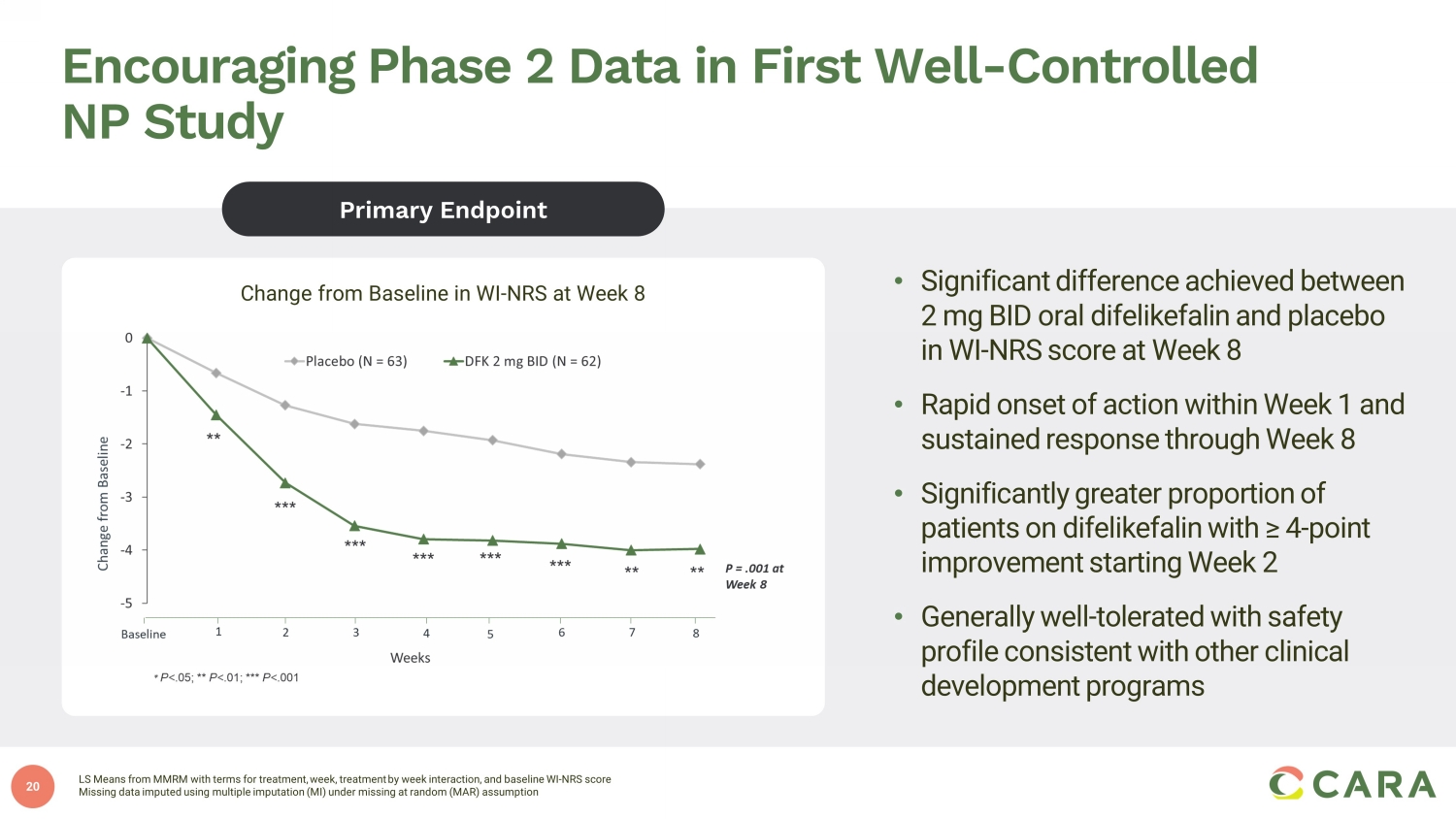 20 Primary Endpoint Change from Baseline in WI - NRS at Week 8 Encouraging Phase 2 Data in First Well - Controlled NP Study • Significant difference achieved between 2 mg BID oral difelikefalin and placebo in WI - NRS score at Week 8 • Rapid onset of action within Week 1 and sustained response through Week 8 • Significantly greater proportion of patients on difelikefalin with ≥ 4 - point improvement starting Week 2 • Generally well - tolerated with safety profile consistent with other clinical development programs LS Means from MMRM with terms for treatment, week, treatment by week interaction, and baseline WI - NRS score Missing data imputed using multiple imputation (MI) under missing at random (MAR) assumption