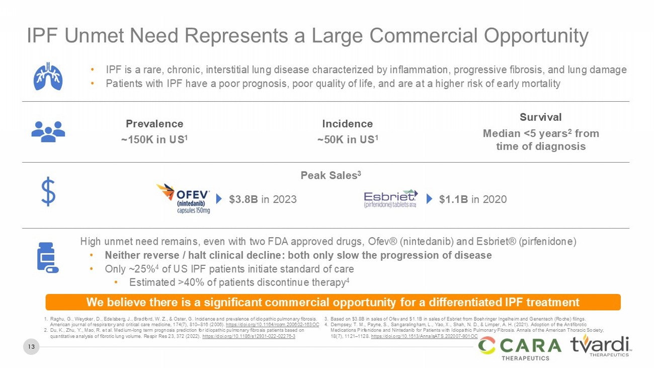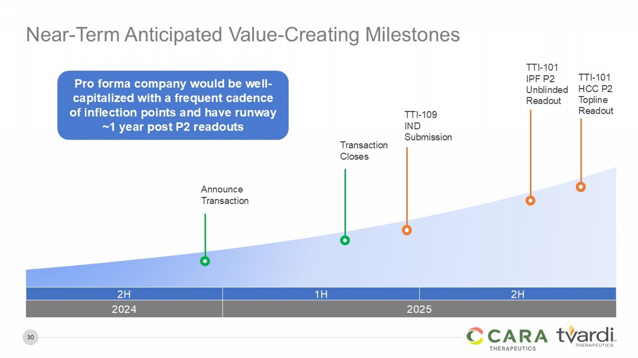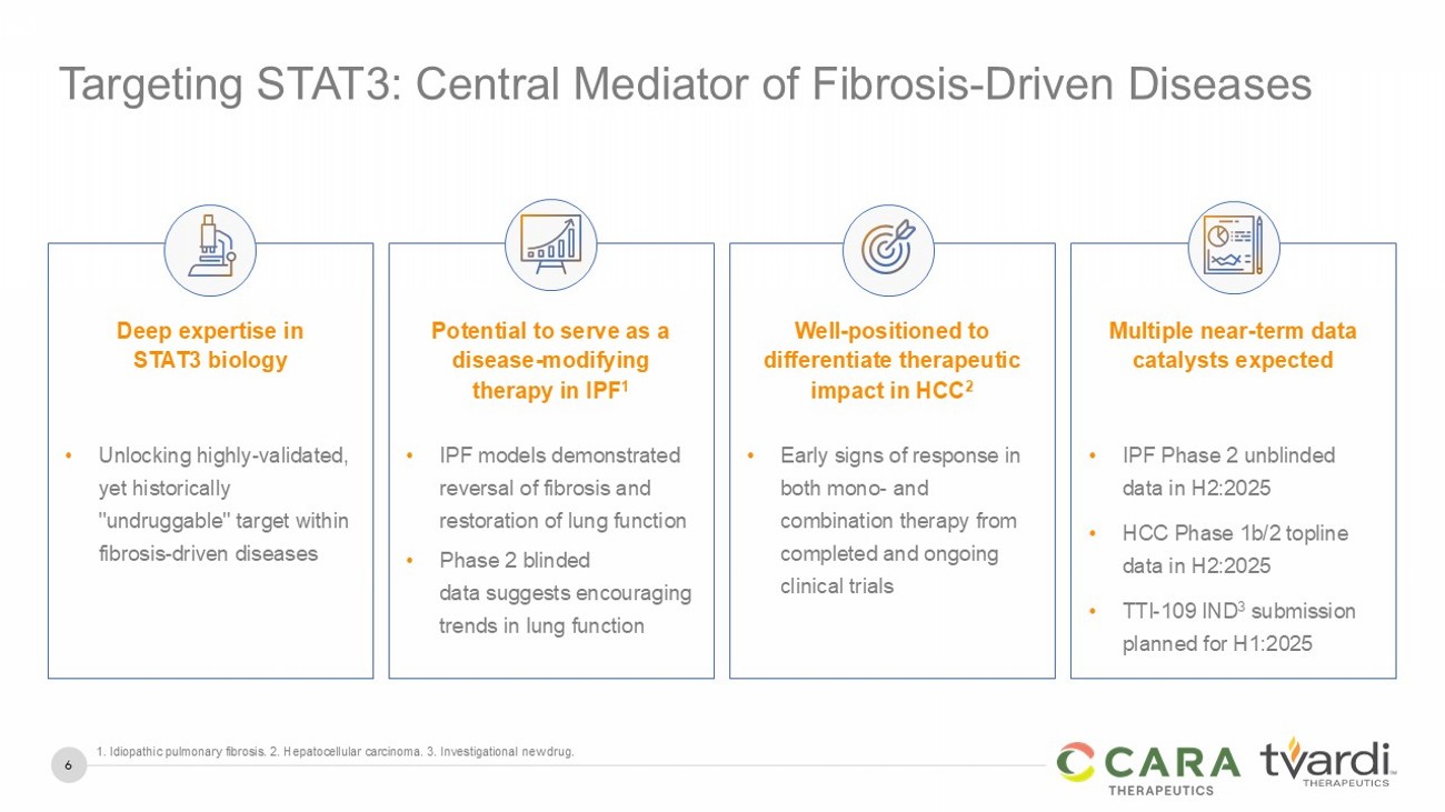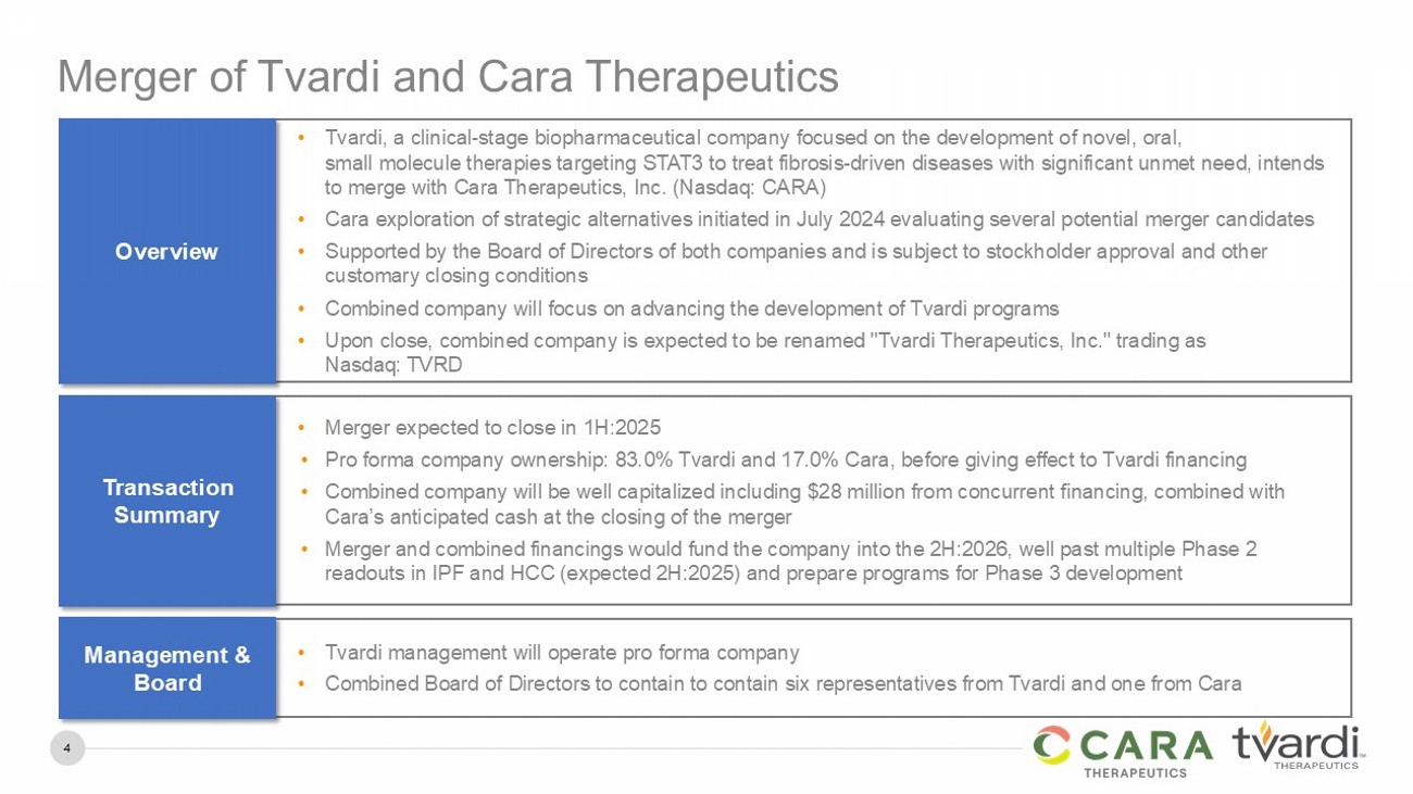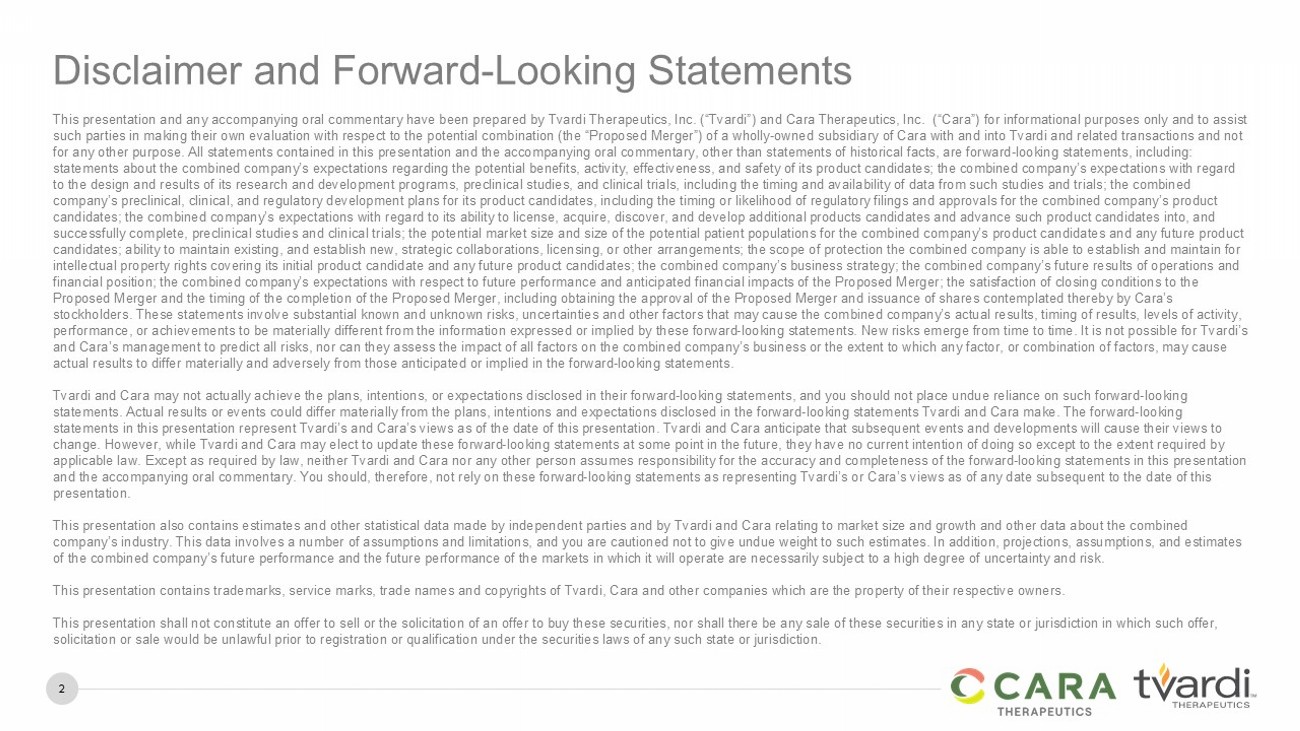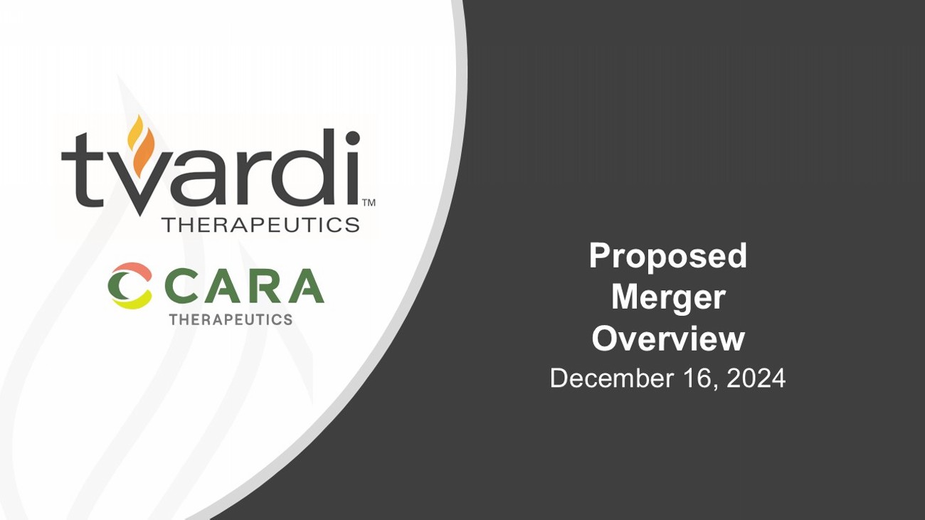 2 Disclaimer and Forward - Looking Statements This presentation and any accompanying oral commentary have been prepared by Tvardi Therapeutics, Inc. (“Tvardi”) and Cara Th era peutics, Inc. (“Cara”) for informational purposes only and to assist such parties in making their own evaluation with respect to the potential combination (the “Proposed Merger”) of a wholly - owned subsidiary of Cara with and into Tvardi and related transactions and not for any other purpose. All statements contained in this presentation and the accompanying oral commentary, other than stateme nts of historical facts, are forward - looking statements, including: statements about the combined company’s expectations regarding the potential benefits, activity, effectiveness, and safety of it s product candidates; the combined company’s expectations with regard to the design and results of its research and development programs, preclinical studies, and clinical trials, including the t imi ng and availability of data from such studies and trials; the combined company’s preclinical, clinical, and regulatory development plans for its product candidates, including the timing or likelihood of regulatory filings and approvals for the combined company’s product candidates; the combined company’s expectations with regard to its ability to license, acquire, discover, and develop additio nal products candidates and advance such product candidates into, and successfully complete, preclinical studies and clinical trials; the potential market size and size of the potential patient p opu lations for the combined company’s product candidates and any future product candidates; ability to maintain existing, and establish new, strategic collaborations, licensing, or other arrangements; the sco pe of protection the combined company is able to establish and maintain for intellectual property rights covering its initial product candidate and any future product candidates; the combined company’s bu siness strategy; the combined company’s future results of operations and financial position; the combined company’s expectations with respect to future performance and anticipated financial impacts of the Proposed Merger; the satisfaction of closing conditions to the Proposed Merger and the timing of the completion of the Proposed Merger, including obtaining the approval of the Proposed Mer ger and issuance of shares contemplated thereby by Cara’s stockholders. These statements involve substantial known and unknown risks, uncertainties and other factors that may cause th e c ombined company’s actual results, timing of results, levels of activity, performance, or achievements to be materially different from the information expressed or implied by these forward - looking state ments. New risks emerge from time to time. It is not possible for Tvardi’s and Cara’s management to predict all risks, nor can they assess the impact of all factors on the combined company’s business or the extent to which any factor, or combination of factors, may cause actual results to differ materially and adversely from those anticipated or implied in the forward - looking statements. Tvardi and Cara may not actually achieve the plans, intentions, or expectations disclosed in their forward - looking statements, a nd you should not place undue reliance on such forward - looking statements. Actual results or events could differ materially from the plans, intentions and expectations disclosed in the for war d - looking statements Tvardi and Cara make. The forward - looking statements in this presentation represent Tvardi’s and Cara’s views as of the date of this presentation. Tvardi and Cara anti cip ate that subsequent events and developments will cause their views to change. However, while Tvardi and Cara may elect to update these forward - looking statements at some point in the future, they ha ve no current intention of doing so except to the extent required by applicable law. Except as required by law, neither Tvardi and Cara nor any other person assumes responsibility for the accura cy and completeness of the forward - looking statements in this presentation and the accompanying oral commentary. You should, therefore, not rely on these forward - looking statements as representing Tvardi ’s or Cara’s views as of any date subsequent to the date of this presentation. This presentation also contains estimates and other statistical data made by independent parties and by Tvardi and Cara relat ing to market size and growth and other data about the combined company’s industry. This data involves a number of assumptions and limitations, and you are cautioned not to give undue weigh t t o such estimates. In addition, projections, assumptions, and estimates of the combined company’s future performance and the future performance of the markets in which it will operate are necessari ly subject to a high degree of uncertainty and risk. This presentation contains trademarks, service marks, trade names and copyrights of Tvardi, Cara and other companies which ar e t he property of their respective owners. This presentation shall not constitute an offer to sell or the solicitation of an offer to buy these securities, nor shall th ere be any sale of these securities in any state or jurisdiction in which such offer, solicitation or sale would be unlawful prior to registration or qualification under the securities laws of any such state or jur isdiction.