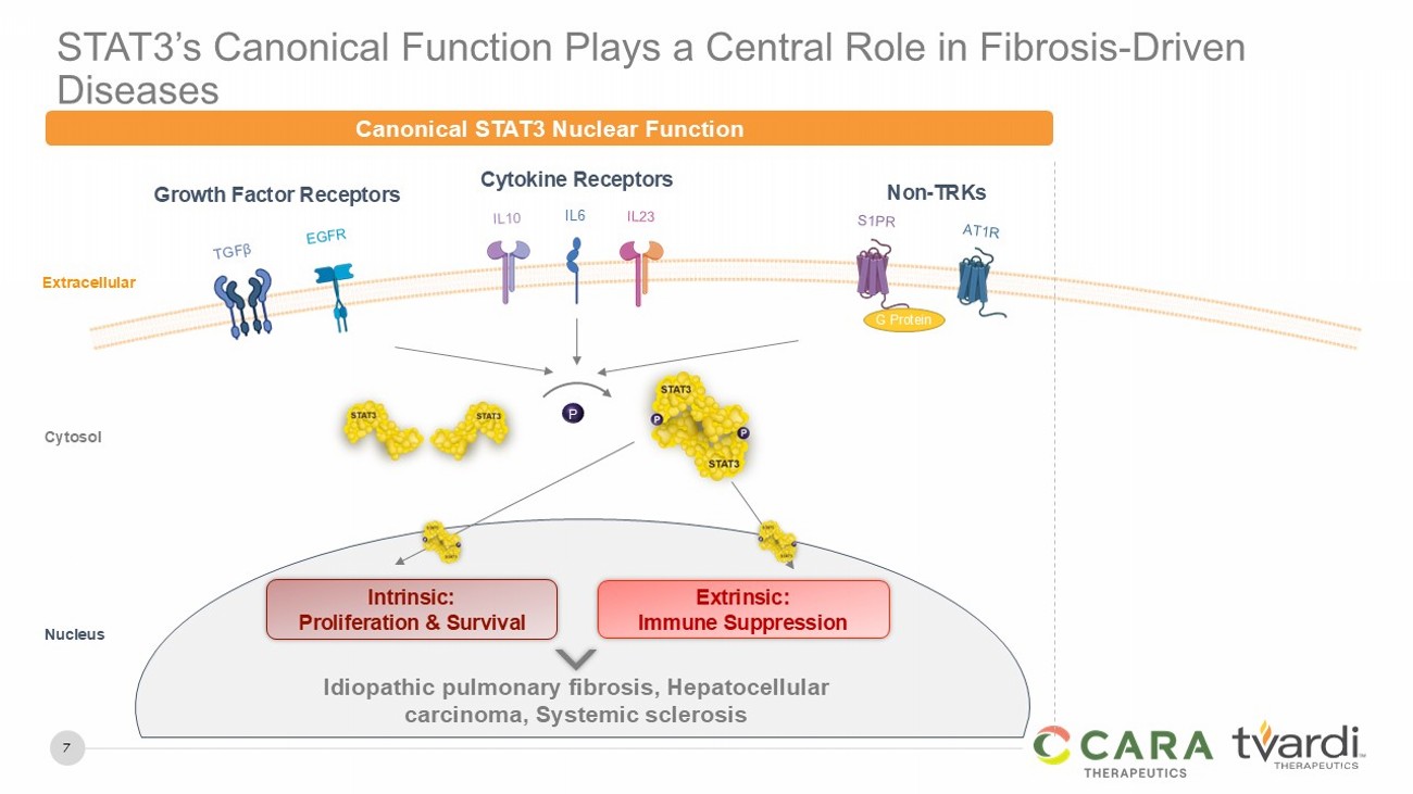 6 Targeting STAT3: Central Mediator of Fibrosis - Driven Diseases Deep expertise in STAT3 biology Potential to serve as a disease - modifying therapy in IPF 1 Well - positioned to differentiate therapeutic impact in HCC 2 Multiple near - term data catalysts expected • Unlocking highly - validated, yet historically "undruggable" target within fibrosis - driven diseases • IPF models demonstrated reversal of fibrosis and restoration of lung function • Phase 2 blinded data suggests encouraging trends in lung function • Early signs of response in both mono - and combination therapy from completed and ongoing clinical trials • IPF Phase 2 unblinded data in H2:2025 • HCC Phase 1b/2 topline data in H2:2025 • TTI - 109 IND 3 submission planned for H1:2025 1. Idiopathic pulmonary fibrosis. 2 . Hepatocellular carcinoma. 3. Investigational new drug.