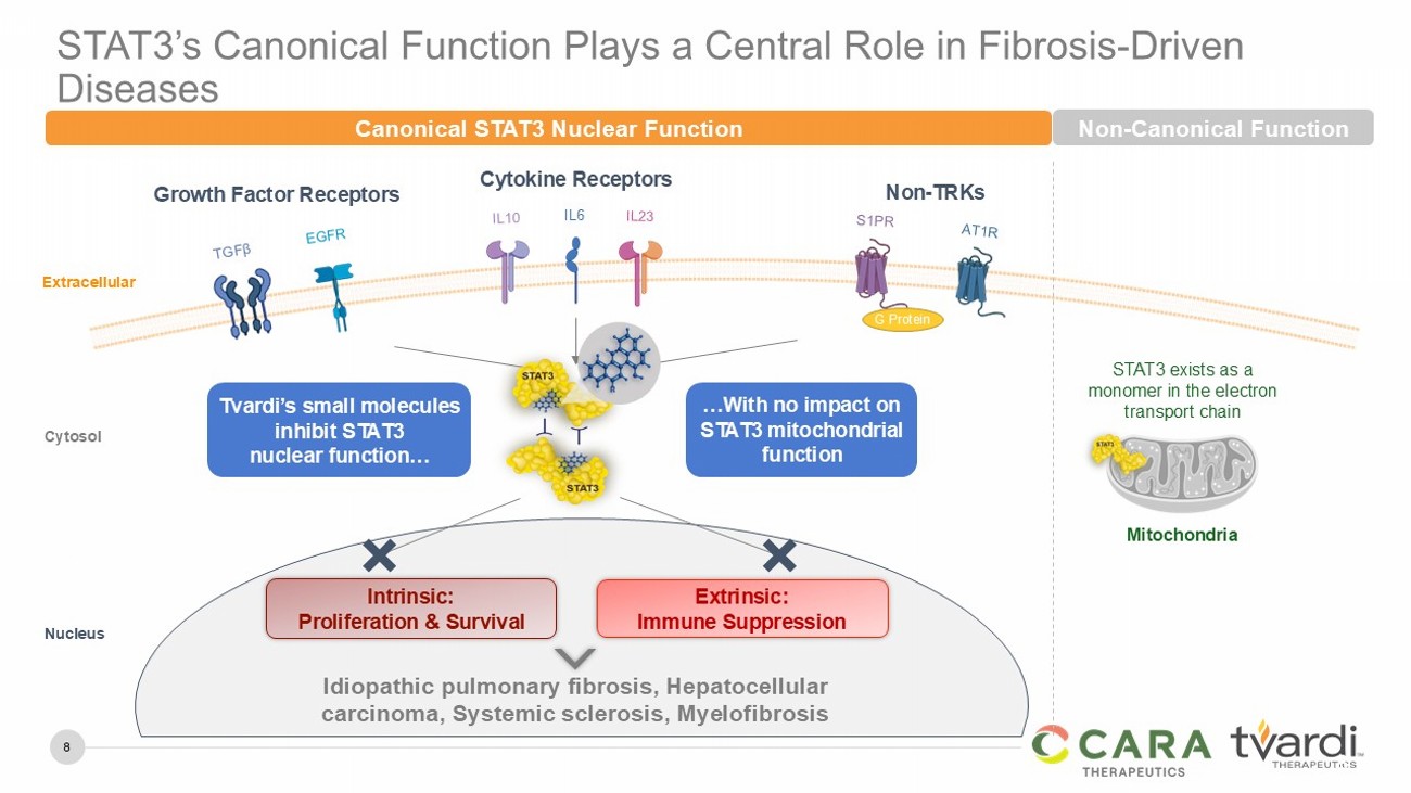 7 STAT3’s Canonical Function Plays a Central Role in Fibrosis - Driven Diseases CONFIDENTIAL P 7 IL6 Growth Factor Receptors Cytokine Receptors Non - TRKs Extracellular Intrinsic: Proliferation & Survival Extrinsic: Immune Suppression Idiopathic pulmonary fibrosis, Hepatocellular carcinoma, Systemic sclerosis Cytosol Nucleus G Protein Canonical STAT3 Nuclear Function