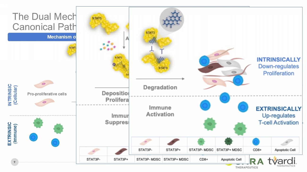 9 The Dual Mechanism of Action of STAT3’s Function in the Canonical Pathway EXTRINSICALLY Up - regulates T - cell Activation Immune Activation Degradation Tvardi’s Approach Tvardi’s Impact INTRINSICALLY D own - regulates Proliferation INTRINSIC (Cellular) EXTRINSIC ( Immune) Immune Suppression Pro - proliferative cells Activation of STAT3 Deposition and Proliferation Mechanism of the Canonical Pathway Apoptotic Cell CD8+ STAT3P+ MDSC STAT3P - MDSC STAT3P+ STAT3P -