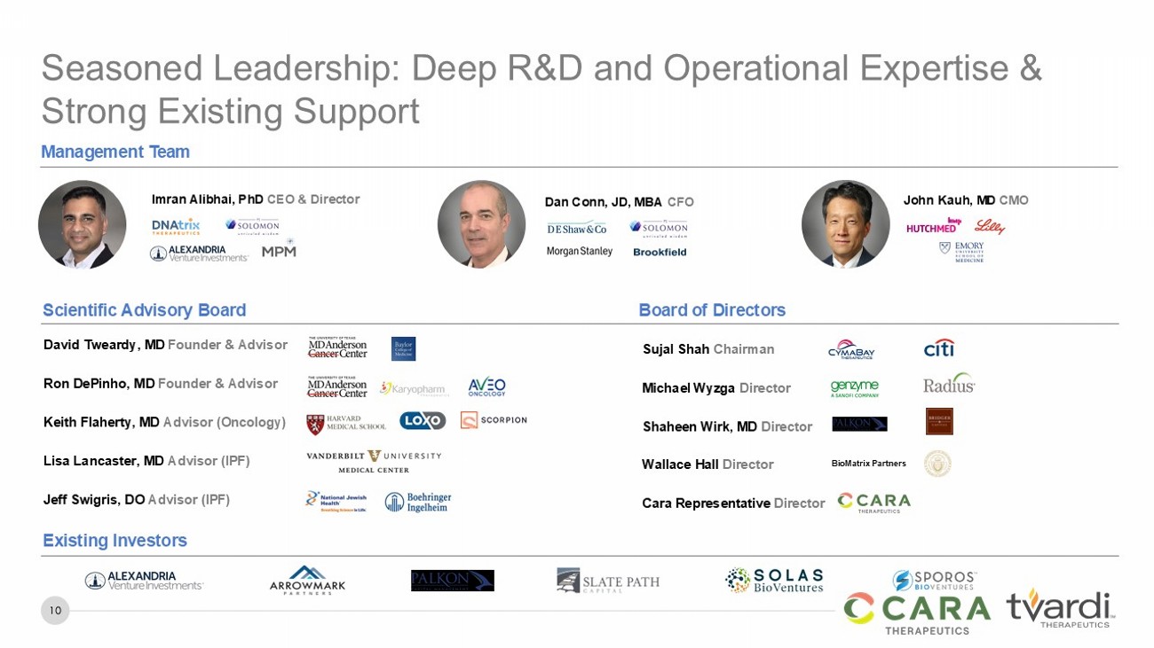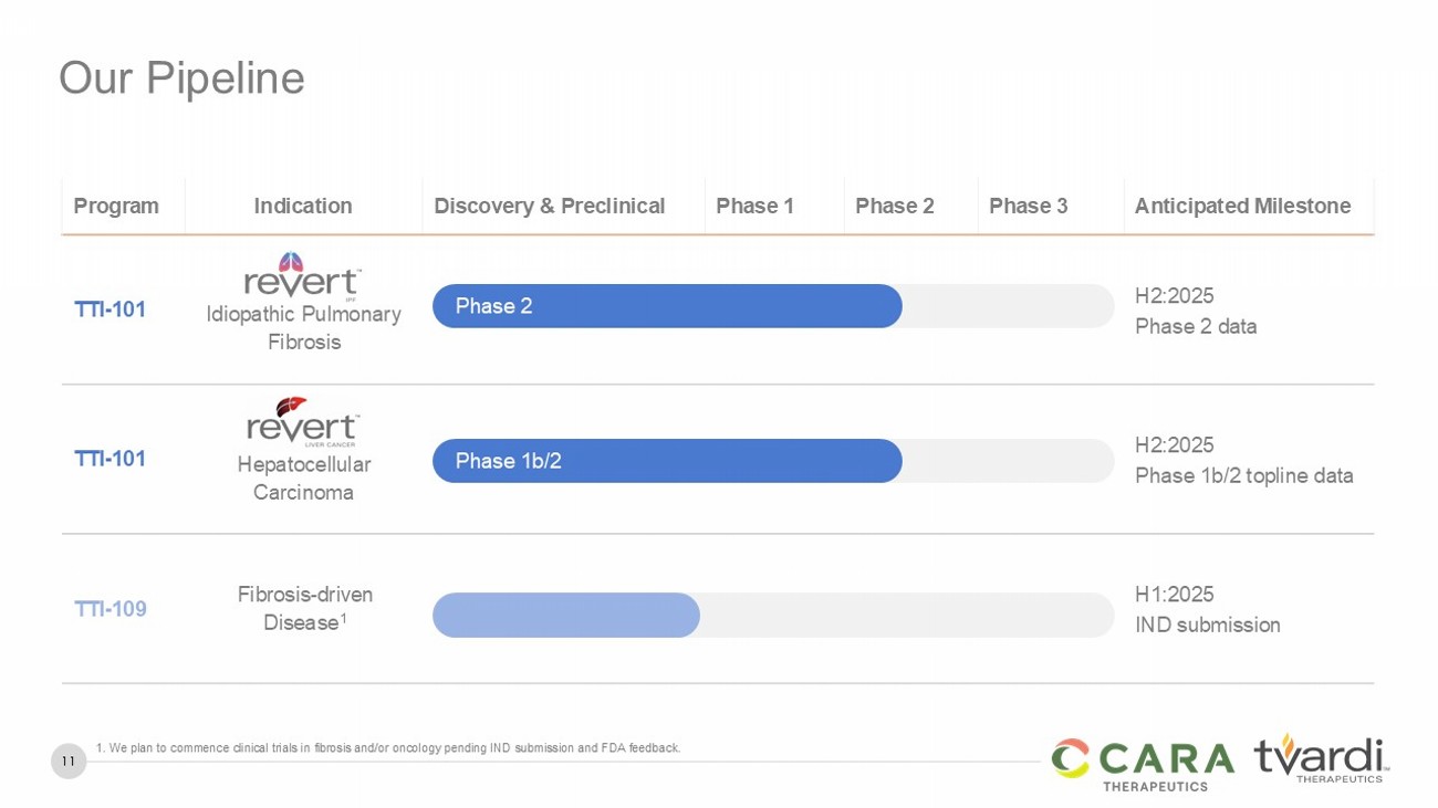 10 Sujal Shah Chairman Michael Wyzga Director Shaheen Wirk , MD Director Wallace Hall Director Cara Representative Director Seasoned Leadership: Deep R&D and Operational Expertise & Strong Existing Support Dan Conn, JD, MBA CFO John Kauh , MD CMO Imran Alibhai, PhD CEO & Director David Tweardy, MD Founder & Advisor Ron DePinho, MD Founder & Advisor Keith Flaherty, MD Advisor (Oncology) Lisa Lancaster, MD Advisor (IPF) Jeff Swigris , DO Advisor (IPF) Management Team Scientific Advisory Board Existing Investors Board of Directors BioMatrix Partners