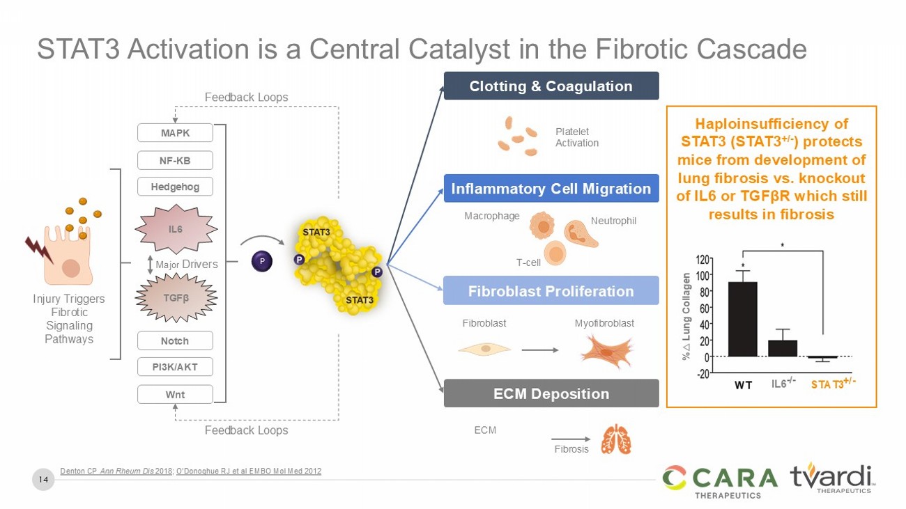 14 STAT3 Activation is a Central Catalyst in the Fibrotic Cascade IL6 - / - STAT3 +/ - WT % △ Lung Collagen Denton CP Ann Rheum Dis 2018 ; O’Donoghue RJ et al EMBO Mol Med 2012 Notch IL6 TGF β NF - KB MAPK Hedgehog PI3K/AKT Wnt Injury Triggers Fibrotic Signaling Pathways Haploinsufficiency of STAT3 (STAT3 +/ - ) protects mice from development of lung fibrosis vs. knockout of IL6 or TGF β R which still results in fibrosis Clotting & Coagulation Fibroblast Proliferation ECM Deposition Macrophage Neutrophil T - cell Platelet Activation ECM Fibrosis Myofibroblast Fibroblast Inflammatory Cell Migration P Major Drivers Feedback Loops Feedback Loops