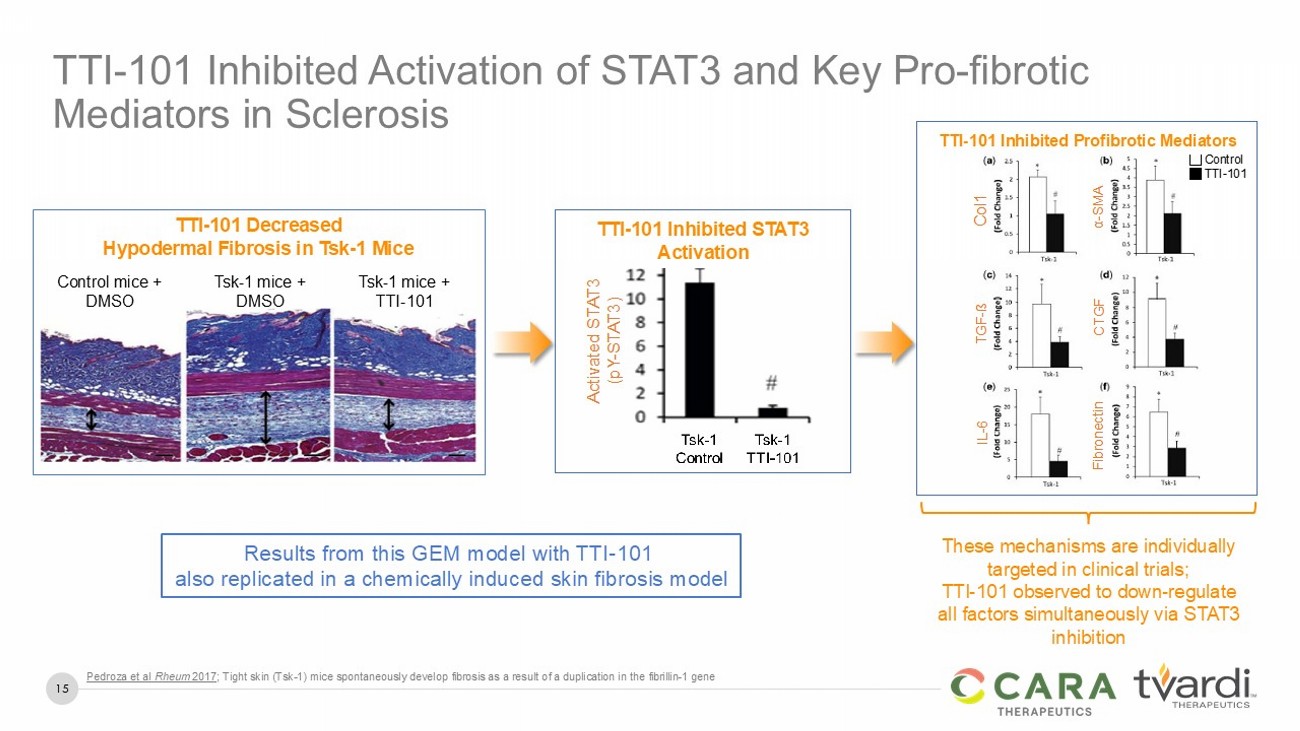 15 Pedroza et al Rheum 2017 ; Tight skin (Tsk - 1) mice spontaneously develop fibrosis as a result of a duplication in the fibrillin - 1 gene TTI - 101 Inhibited Activation of STAT3 and Key Pro - fibrotic Mediators in Sclerosis TTI - 101 Decreased Hypodermal Fibrosis in Tsk - 1 Mice Control mice + DMSO Tsk - 1 mice + DMSO Tsk - 1 mice + TTI - 101 These mechanisms are individually targeted in clinical trials; TTI - 101 observed to down - regulate all factors simultaneously via STAT3 inhibition Results from this GEM model with TTI - 101 also replicated in a chemically induced skin fibrosis model TTI-101 Inhibits STAT3 Activation A c t i v a t e d S T A T 3 ( p Y - S T A T 3 ) TTI - 101 Inhibited STAT3 Activation TTI - 101 Inhibited Profibrotic Mediators