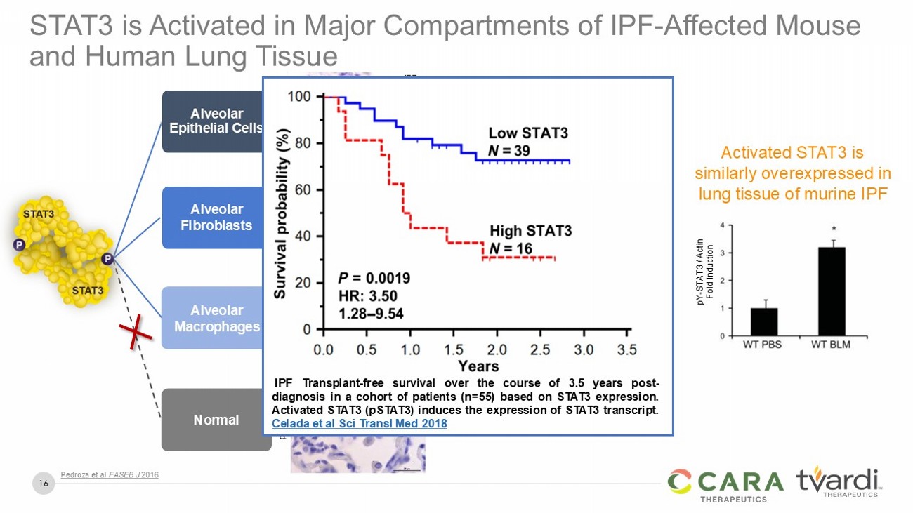 16 STAT3 is Activated in Major Compartments of IPF - Affected Mouse and Human Lung Tissue Pedroza et al FASEB J 2016 Activated STAT3 is overexpressed in IPF h uman lung tissue Activated STAT3 is similarly overexpressed in lung tissue of murine IPF pY - STAT3 / GAPDH Fold Induction pY - STAT3 / Actin Fold Induction Alveolar Epithelial Cells Alveolar Fibroblasts Alveolar Macrophages Normal pY - STAT3 pY - STAT3 pY - STAT3 pY - STAT3 IPF Transplant - free survival over the course of 3 . 5 years post - diagnosis in a cohort of patients (n= 55 ) based on STAT 3 expression . Activated STAT 3 (pSTAT 3 ) induces the expression of STAT 3 transcript . Celada et al Sci Transl Med 2018