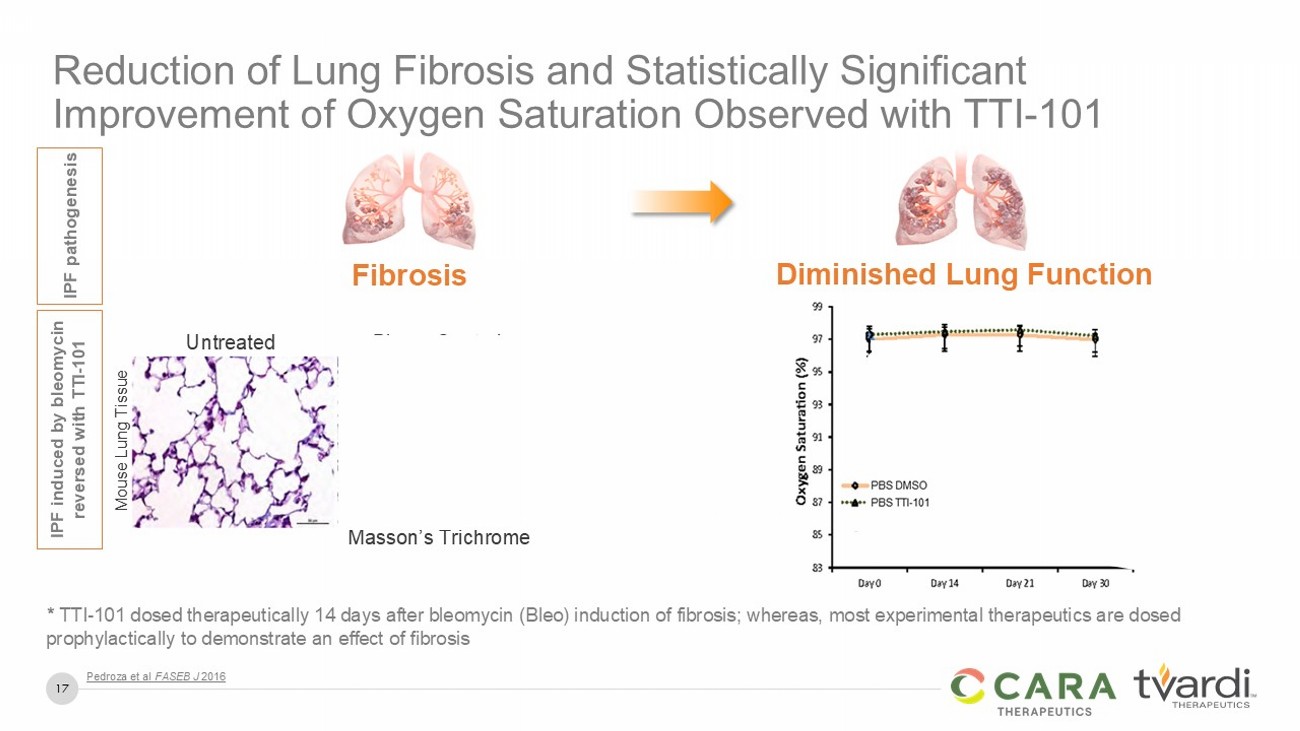 17 Reduction of Lung Fibrosis and Statistically Significant Improvement of Oxygen Saturation Observed with TTI - 101 * TTI - 101 dosed therapeutically 14 days after bleomycin ( Bleo ) induction of fibrosis; whereas, most experimental therapeutics are dosed prophylactically to demonstrate an effect of fibrosis Pedroza et al FASEB J 2016 Untreated Bleo + Control TTI - 101 + 14 days after Bleo IPF pathogenesis IPF induced by bleomycin reversed with TTI - 101 Fibrosis Diminished Lung Function Masson’s Trichrome Mouse Lung Tissue