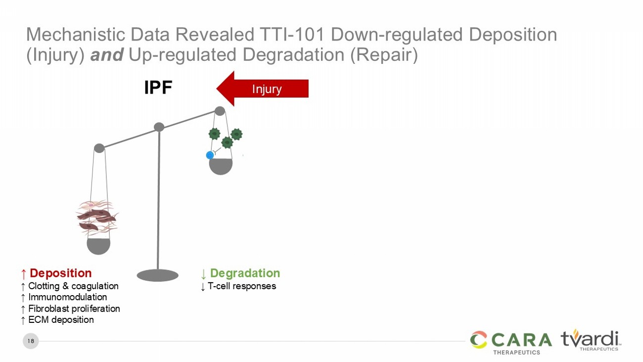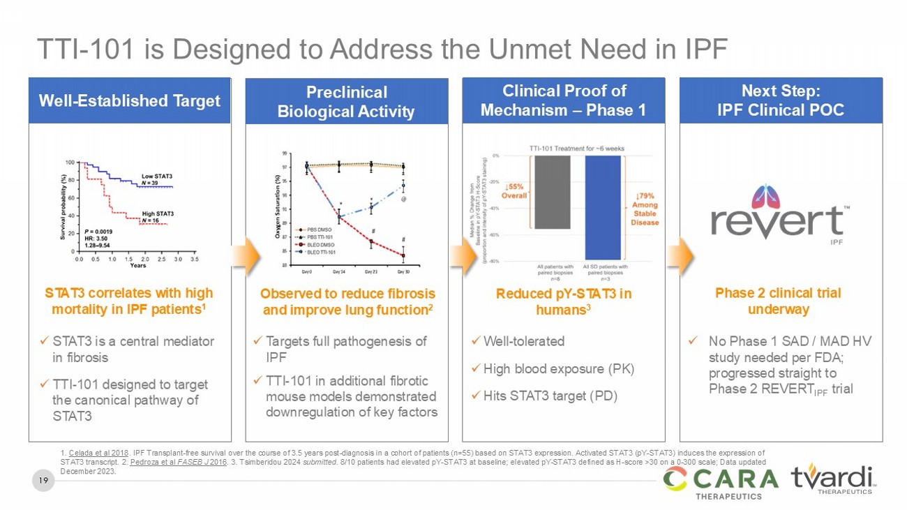 18 Mechanistic Data Revealed TTI - 101 Down - regulated Deposition (Injury) and Up - regulated Degradation (Repair) ↑ Deposition ↑ Clotting & coagulation ↑ Immunomodulation ↑ Fibroblast proliferation ↑ ECM deposition IPF ↓ Degradation ↓ T - cell responses ↓ Deposition x Attenuation of clotting & coagulation x Reverse fibroblast activation x Reverse ECM deposition IPF + ↑ Degradation x Induce T - cell maturation and activation x Induce cytotoxic effect of NK - and T - cells Repair Injury