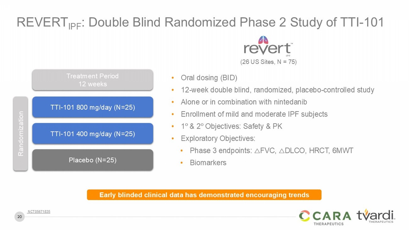 19 x STAT3 is a central mediator in fibrosis x TTI - 101 designed to target the canonical pathway of STAT3 STAT3 correlates with high mortality in IPF patients 1 x Well - tolerated x High blood exposure (PK) x Hits STAT3 target (PD) Reduced pY - STAT3 in humans 3 x No Phase 1 SAD / MAD HV study needed per FDA; progressed straight to Phase 2 REVERT IPF trial Phase 2 clinical trial underway Well - Established Target Clinical Proof of Mechanism – Phase 1 Next Step: IPF Clinical POC Preclinical Biological Activity x Targets full pathogenesis of IPF x TTI - 101 in additional fibrotic mouse models demonstrated downregulation of key factors Observed to reduce fibrosis and improve lung function 2 TTI - 101 is Designed to Address the Unmet Need in IPF 1. Celada et al 2018 . IPF Transplant - free survival over the course of 3.5 years post - diagnosis in a cohort of patients (n=55) based on STAT3 expression. Activated STAT3 (pY - STAT3) induces the expression of STAT3 transcript. 2 . Pedroza et al FASEB J 2016 . 3. Tsimberidou 2024 submitted . 8/10 patients had elevated pY - STAT3 at baseline; elevated pY - STAT3 defined as H - score >30 on a 0 - 300 scale; Data updated December 2023.