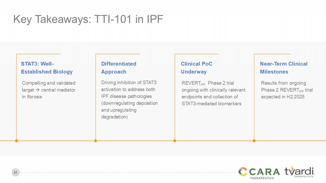 20 REVERT IPF : Double Blind Randomized Phase 2 Study of TTI - 101 • Oral dosing (BID) • 12 - week d ouble blind, randomized, placebo - controlled study • Alone or in combination with nintedanib • Enrollment of mild and moderate IPF subjects • 1º & 2º Objectives: Safety & PK • Exploratory Objectives: • Phase 3 endpoints: ᶭ FVC, △ DLCO, HRCT, 6MWT • Biomarkers TTI - 101 800 mg/day (N=25) TTI - 101 400 mg/day (N=25) Placebo (N=25) Randomization Treatment Period 12 weeks Early blinded clinical data has demonstrated encouraging trends (26 US Sites, N = 75) NCT05671835