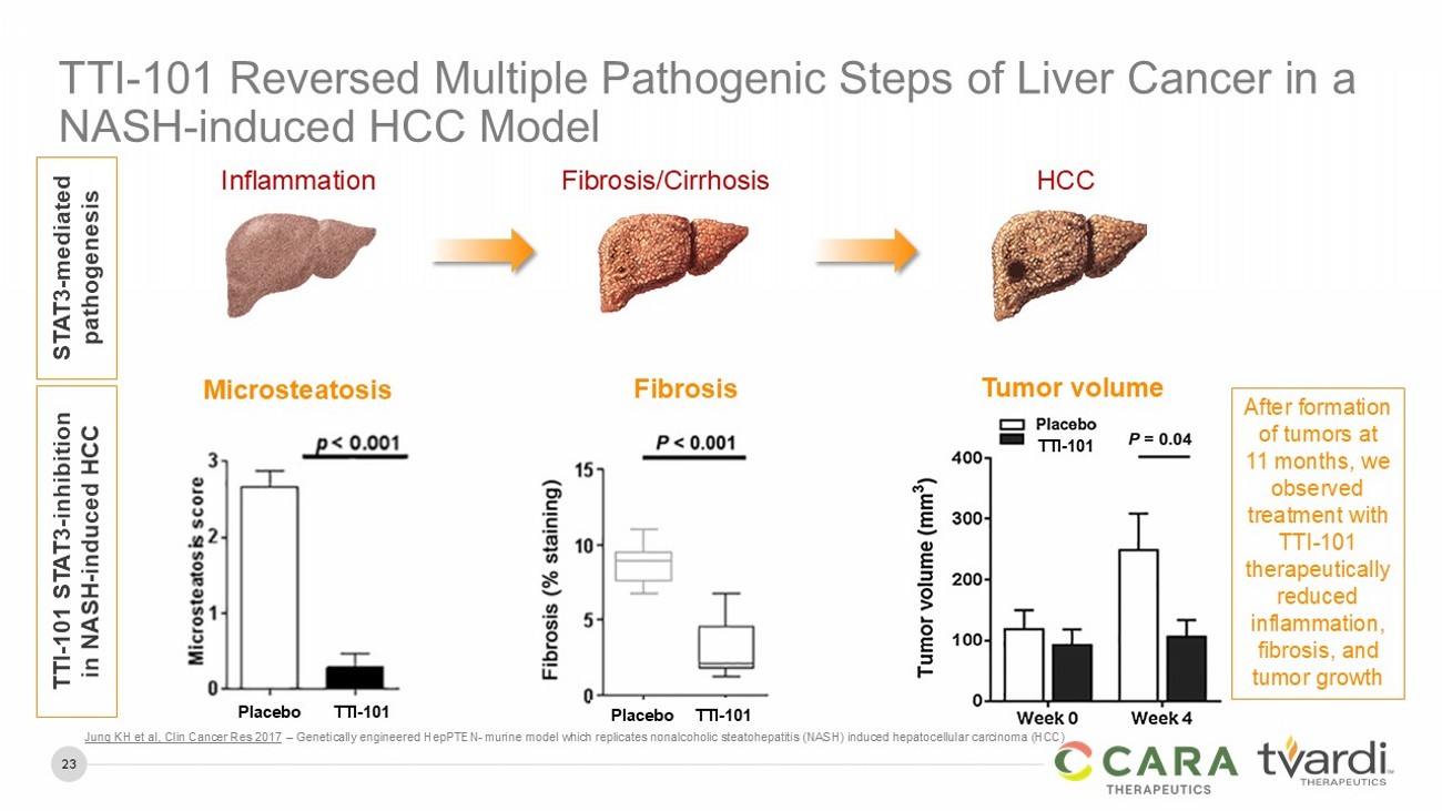 23 TTI - 101 Reversed Multiple Pathogenic Steps of Liver Cancer in a NASH - induced HCC Model Inflammation Fibrosis/Cirrhosis HCC STAT3 - mediated pathogenesis TTI - 101 STAT3 - inhibition in NASH - induced HCC TTI - 101 Tumor volume Microsteatosis Placebo TTI - 101 TTI - 101 Fibrosis Placebo TTI - 101 After formation of tumors at 11 months, we observed treatment with TTI - 101 therapeutically reduced inflammation, fibrosis, and tumor growth Jung KH et al, Clin Cancer Res 2017 – Genetically engineered HepPTEN - murine model which replicates nonalcoholic steatohepatitis (NASH) induced hepatocellular carcinoma (HCC)