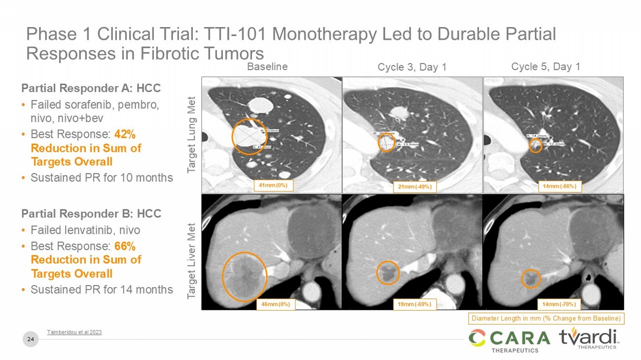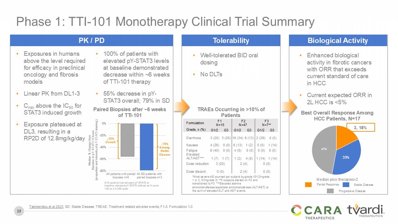 24 Phase 1 Clinical Trial: TTI - 101 Monotherapy Led to Durable Partial Responses in Fibrotic Tumors Baseline Cycle 5, Day 1 Cycle 3, Day 1 Diameter Length in mm (% Change from Baseline) 41mm (0%) 14mm ( - 66%) 21mm ( - 49%) 14mm ( - 70%) 19mm ( - 59%) 46mm (0%) Target Lung Met Target Liver Met Partial Responder A: HCC • Failed sorafenib, pembro, nivo , nivo+bev • Best Response: 42% Reduction in Sum of Targets Overall • Sustained PR for 10 months Partial Responder B: HCC • Failed lenvatinib , nivo • Best Response: 66% Reduction in Sum of Targets Overall • Sustained PR for 14 months Tsimberidou et al 2023