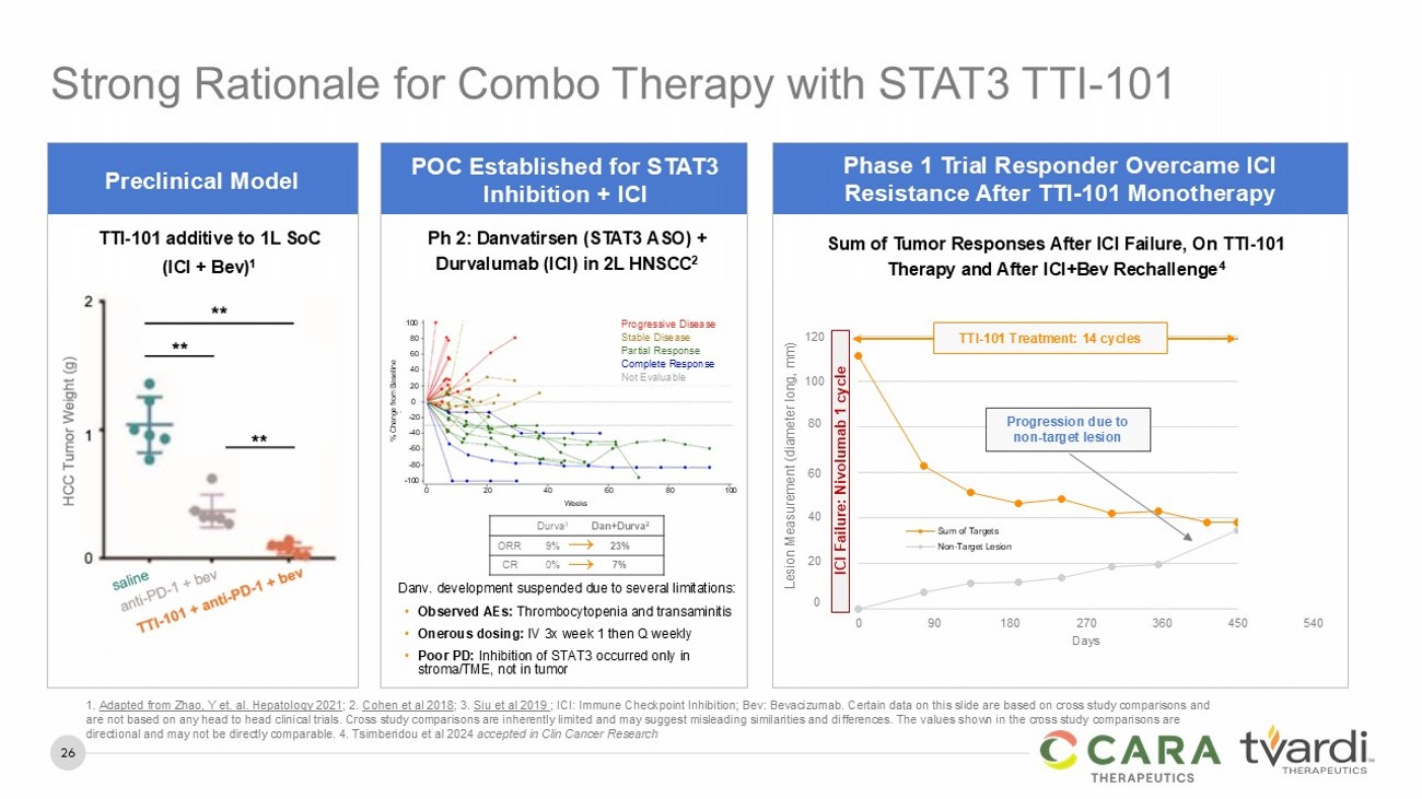25 • Well - t olerated BID oral dosing • No DLTs *Most severe AE counted per subject by grade (G1/2=grade 1 or 2, G3=grade 3) **5 subjects started on F2 and transitioned to F3 ***Elevated alanine aminotransferase/aspartate aminotransferase (ALT/AST) is the sum of elevated ALT and AST events Tolerability TRAEs Occurring in >10% of Patients • Exposure s in humans above the level required for efficacy in preclinical oncology and fibrosis models • Linear PK from DL1 - 3 • C min above the IC 90 for STAT3 induced growth • Exposure plateaued at DL3, resulting in a RP2D of 12.8mg/kg/day Median % Change from Baseline in pY - STAT3 H - Score (proportion and intensity of pY - STAT3 staining) All patients with paired biopsies n=8 All SD patients with paired biopsies n=3 -80% -60% -40% -20% 0% ↓79% Among Stable Disease 8/10 patients had elevated pY - STAT3 at baseline; elevated pY - STAT3 defined as H - score >30 on a 0 - 300 scale ↓55% Overall • 100% of patients with elevated pY - STAT3 levels at baseline demonstrated decrease within ~6 weeks of TTI - 101 therapy • 55% decrease in pY - STAT3 overall; 79% in SD PK / PD • Enhanced biological activity in fibrotic cancers with ORR that exceeds current standard of care in HCC • Current expected ORR in 2L HCC is <5% 35% 47% 3, 18% Best Overall Response Among HCC Patients, N=17 Median prior therapies=2 Biological Activity Paired Biopsies after ~6 weeks of TTI - 101 Partial Response Stable Disease Progressive Disease Phase 1: TTI - 101 Monotherapy Clinical Trial Summary F3 N=7** F2 N=47 F1 N=15 Formulation G3 G1/2 G3 G1/2 G3 G1/2 Grade, n (%) 0 (0) 2 (29) 6 (13) 16 (34) 3 (20) 3 (20) Diarrhoea 1 (14) 0 (0) 1 (2) 6 (13) 0 (0) 4 (26) Nausea 0 (0) 0 (0) 0 (0) 4 (8) 0 (0) 6 (40) Fatigue 1 (14) 1 (14) 4 (8) 1 (2) 1 (7) 1 (7) Elevated ALT/AST*** 0 (0) 2 (4) 3 (20) Dose reduction 0 (0) 2 (4) 0 (0) Dose discont. Tsimberidou et al 2023 ; SD: Stable Disease; TREAE: Treatment related adverse events; F1 - 3: Formulation 1 - 3
