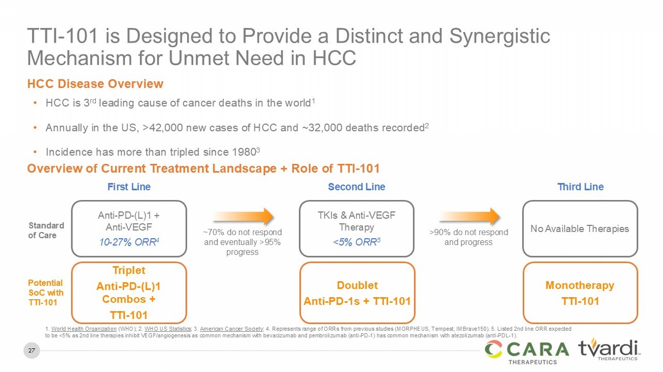 26 → → Ph 2: Danvatirsen (STAT3 ASO) + Durvalumab (ICI) in 2L HNSCC 2 % Change from Baseline 0 - 20 - 40 - 60 - 80 - 100 20 40 60 80 100 0 20 40 60 80 100 Weeks Danv . development suspended due to several limitations: • Observed AEs: Thrombocytopenia and transaminitis • Onerous dosing: IV 3x week 1 then Q weekly • Poor PD: Inhibition of STAT3 occurred only in stroma/TME, not in tumor Progressive Disease Stable Disease Partial Response Complete Response Not Evaluable POC Established for STAT3 Inhibition + ICI Strong Rationale for Combo Therapy with STAT3 TTI - 101 Dan+Durva 2 Durva 3 23% 9% ORR 7% 0% CR TTI - 101 additive to 1L SoC (ICI + Bev) 1 Preclinical Model 0 20 40 60 80 100 120 0 90 180 270 360 450 540 Days Sum of Targets Non-Target Lesion Progression due to non - target lesion New Response ICI + Bev Rechallenge Sum of Tumor Responses After ICI Failure, On TTI - 101 Therapy and After ICI+Bev Rechallenge 4 0 20 40 60 80 100 120 ICI Failure: Nivolumab 1 cycle Lesion Measurement (diameter long, mm) Phase 1 Trial Responder Overcame ICI Resistance After TTI - 101 Monotherapy 1. Adapted from Zhao, Y et. al. Hepatology 2021 ; 2. Cohen et al 2018 ; 3. Siu et al 2019 ; ICI: Immune Checkpoint Inhibition; Bev: Bevacizumab. Certain data on this slide are based on cross study comparisons and are not based on any head to head clinical trials. Cross study comparisons are inherently limited and may suggest misleading sim ilarities and differences. The values shown in the cross study comparisons are directional and may not be directly comparable. 4. Tsimberidou et al 2024 accepted in Clin Cancer Research TTI - 101 Treatment: 14 cycles