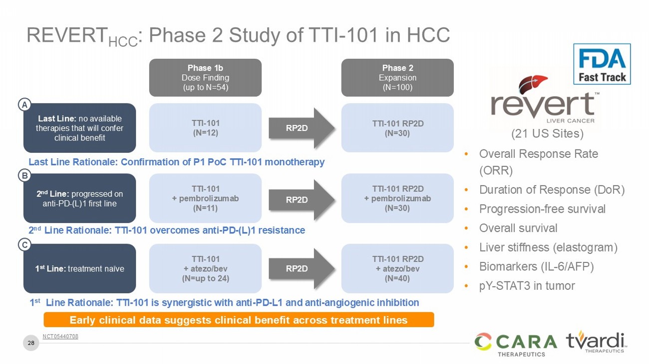 27 Overview of Current Treatment Landscape + Role of TTI - 101 TTI - 101 is Designed to Provide a Distinct and Synergistic Mechanism for Unmet Need in HCC • HCC is 3 rd leading cause of cancer deaths in the world 1 • Annually in the US, >42,000 new cases of HCC and ~32,000 deaths recorded 2 • Incidence has more than tripled since 1980 3 HCC Disease Overview Triplet Anti - PD - (L)1 Combos + TTI - 101 Potential SoC with TTI - 101 Doublet Anti - PD - 1s + TTI - 101 Monotherapy TTI - 101 1. World Health Organization (WHO); 2. WHO US Statistics ; 3. American Cancer Society ; 4. Represents range of ORRs from previous studies (MORPHEUS, Tempest, IMBrave150). 5. Listed 2nd line ORR expected to be <5% as 2nd line therapies inhibit VEGF/angiogenesis as common mechanism with bevacizumab and pembrolizumab (anti - PD - 1) has common mechanism with atezolizumab (anti - PDL - 1). Anti - PD - (L)1 + Anti - VEGF 10 - 27% ORR 4 Standard of Care First Line TKIs & Anti - VEGF Therapy <5% ORR 5 Second Line No Available Therapies Third Line ~70% do not respond and eventually >95% progress >90% do not respond and progress
