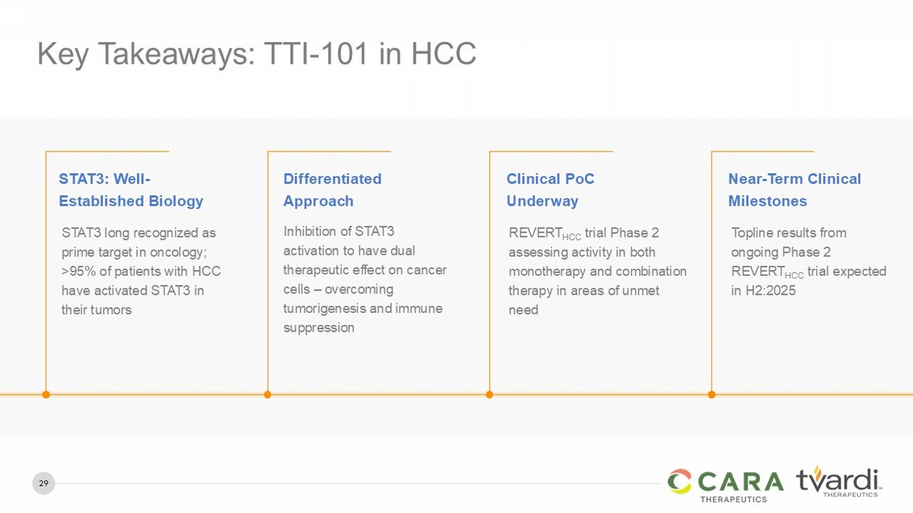28 REVERT HCC : Phase 2 Study of TTI - 101 in HCC • Overall Response Rate (ORR) • Duration of Response ( DoR ) • Progression - free survival • Overall survival • Liver stiffness (elastogram) • Biomarkers (IL - 6/AFP) • pY - STAT3 in tumor (21 US Sites) Phase 1b Dose Finding (up to N=54) Phase 2 Expansion (N=100) TTI - 101 RP2D (N=30) TTI - 101 (N=12) Last Line: no available therapies that will confer clinical benefit RP2D Last Line Rationale: Confirmation of P1 PoC TTI - 101 monotherapy A TTI - 101 RP2D + pembrolizumab (N=30) TTI - 101 + pembrolizumab (N=11) RP2D 2 nd Line Rationale: TTI - 101 overcomes anti - PD - (L)1 resistance 2 nd Line: progressed on anti - PD - (L)1 first line B TTI - 101 RP2D + atezo / bev (N=40) TTI - 101 + atezo / bev (N=up to 24) RP2D 1 st Line Rationale: TTI - 101 is synergistic with anti - PD - L1 and anti - angiogenic inhibition 1 st Line : treatment naïve C NCT05440708 Early clinical data suggests clinical benefit across treatment lines