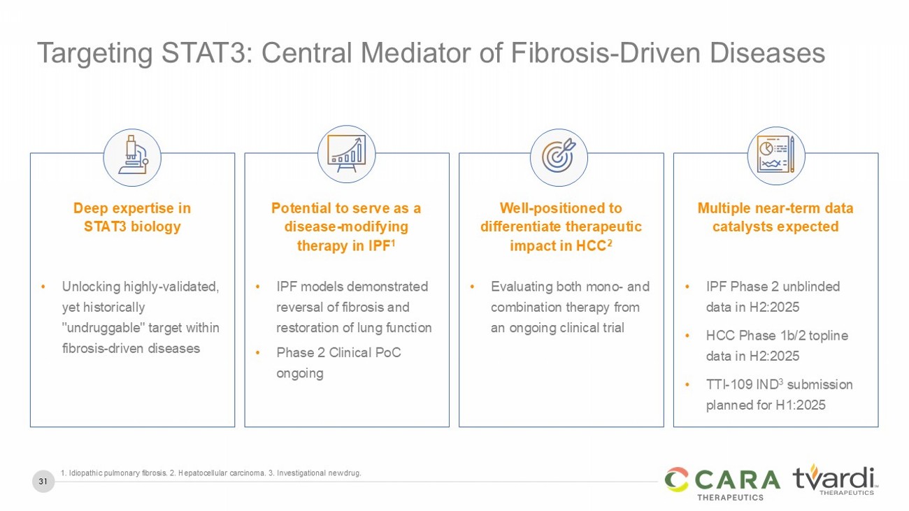 30 Near - Term Anticipated Value - Creating Milestones TTI - 101 HCC P2 Topline Readout TTI - 101 IPF P2 Unblinded Readout Announce Transaction TTI - 109 IND Submission Transaction Closes 2H 1H 2H 2025 2024 Pro forma company would be well - capitalized with a frequent cadence of inflection points and have runway ~1 year post P2 readouts