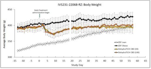 Furthermore, in the DehydraTECH-CBD treated rats the weight loss trend observed did not appear to be a result of lower levels of food or water intake. Food and water intake was comparable in both the treated and untreated obese animal groups suggesting that the weight loss was more so related to enhanced metabolic function.
