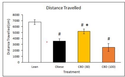 Obesity is often accompanied by reduced activity levels, which were measured in this study via locomotor activity, the distance the animals travelled in open field observations. Interestingly, the lower dose of DehydraTECH-CBD resulted in a statistically significant improvement in locomotor activity compared to the untreated obese control rats (*p<0.05), whereas there was no significant difference accordingly evidenced at the higher dose. As expected, activity levels for all obese rats were significantly lower than the lean control rats (#p<0.05), although only the lower dose DehydraTECH-CBD treated rats approached the activity levels of the lean rats. Previous research has suggested that CBD may enhance motor activity through its action upon the serotonin 5-HT1A receptor.