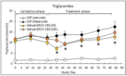 Higher triglyceride levels in the blood can be an indication of the onset of diabetes. One of the best ways to manage triglyceride levels is to lose weight. In study DIAB-A22-1, the animals dosed with DehydraTECH-CBD showed statistically significant reductions in triglyceride levels from day 35 onwards compared to the obese animals not dosed with DehydraTECH-CBD. Once again, the lower dose of 30 mg/Kg of DehydraTECH-CBD outperformed the higher dose of 100mg/kg. By the end of the study the triglyceride levels in the animals receiving 30 mg/Kg of DehydraTECH-CBD was over 25% lower than that of the untreated obese animals (*p=0.007).
