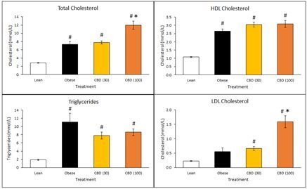Cholesterol levels in the animals receiving DehydraTECH-CBD were also higher. There are two types of cholesterol – HDL and LDL – where HDL cholesterol is generally considered “good” and is desired and LDL cholesterol is generally considered “bad”, although some studies are beginning to question whether this is true. Again, the lower dose of 30 mg/Kg appeared to outperform the higher 100 mg/Kg dose of DehydraTECH-CBD, with a trend toward increased HDL good cholesterol but with no significant effect upon LDL bad cholesterol levels compared to the untreated obese animals. The 100 mg/Kg dosed animals demonstrated increases in both desired HDL and the undesired LDL levels, with significance relative to the untreated obese animals in the latter instance (*p<0.05). The findings with the lower dose therefore appeared to support improved physiological function relative to the diabetic state.