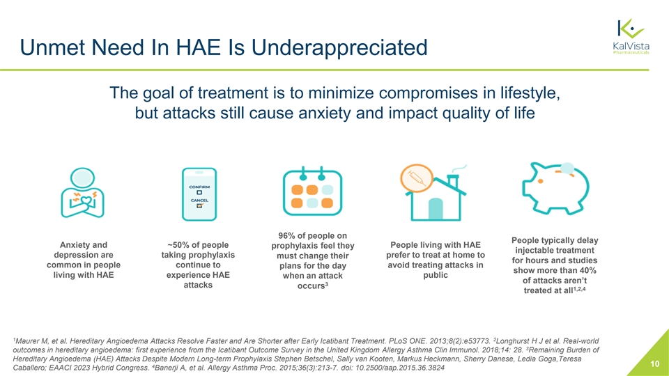 Unmet Need In HAE Is Underappreciated The goal of treatment is to minimize compromises in lifestyle, but attacks still cause anxiety and impact quality of life 96% of people on People typically delay Anxiety and ~50% of people People living with HAE prophylaxis feel they injectable treatment depression are taking prophylaxis prefer to treat at home to must change their for hours and studies common in people continue to plans for the day avoid treating attacks in show more than 40% living with HAE experience HAE public when an attack of attacks aren’t 3 attacks occurs 1,2,4 treated at all 1 2 Maurer M, et al. Hereditary Angioedema Attacks Resolve Faster and Are Shorter after Early Icatibant Treatment. PLoS ONE. 2013;8(2):e53773. Longhurst H J et al. Real-world 3 outcomes in hereditary angioedema: first experience from the Icatibant Outcome Survey in the United Kingdom Allergy Asthma Clin Immunol. 2018;14: 28. Remaining Burden of Hereditary Angioedema (HAE) Attacks Despite Modern Long-term Prophylaxis Stephen Betschel, Sally van Kooten, Markus Heckmann, Sherry Danese, Ledia Goga,Teresa 10 4 Caballero; EAACI 2023 Hybrid Congress. Banerji A, et al. Allergy Asthma Proc. 2015;36(3):213-7. doi: 10.2500/aap.2015.36.3824