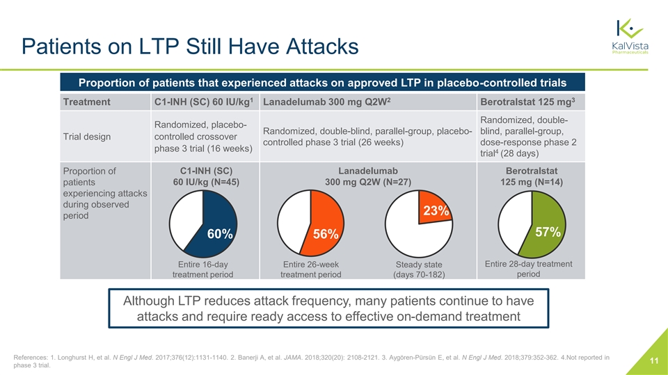 Patients on LTP Still Have Attacks Proportion of patients that experienced attacks on approved LTP in placebo-controlled trials 1 2 3 Treatment C1-INH (SC) 60 IU/kg Lanadelumab 300 mg Q2W Berotralstat 125 mg Randomized, double- Randomized, placebo- Randomized, double-blind, parallel-group, placebo- blind, parallel-group, Trial design controlled crossover controlled phase 3 trial (26 weeks) dose-response phase 2 phase 3 trial (16 weeks) 4 trial (28 days) Proportion of C1-INH (SC) Lanadelumab Berotralstat patients 60 IU/kg (N=45) 300 mg Q2W (N=27) 125 mg (N=14) experiencing attacks during observed 23% period 57% 60% 56% Entire 28-day treatment Entire 16-day Entire 26-week Steady state period treatment period treatment period (days 70-182) Although LTP reduces attack frequency, many patients continue to have attacks and require ready access to effective on-demand treatment References: 1. Longhurst H, et al. N Engl J Med. 2017;376(12):1131-1140. 2. Banerji A, et al. JAMA. 2018;320(20): 2108-2121. 3. Aygören-Pürsün E, et al. N Engl J Med. 2018;379:352-362. 4.Not reported in 11 phase 3 trial.