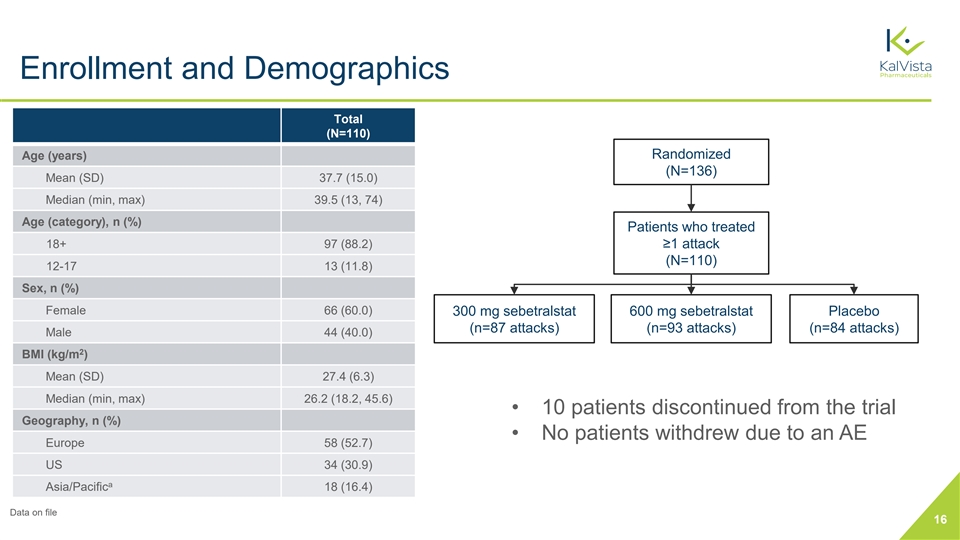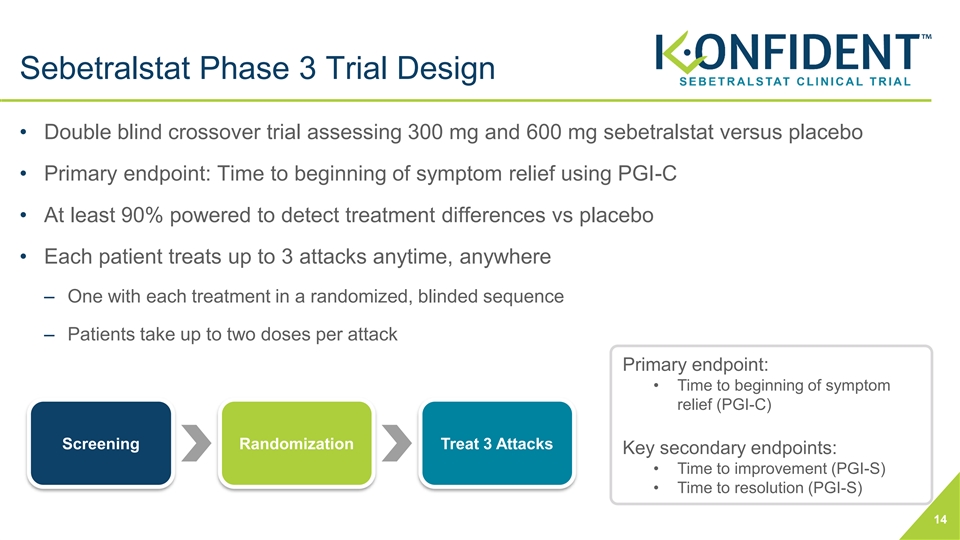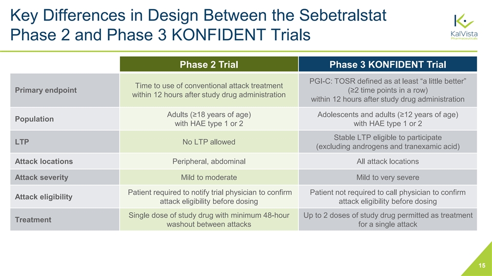 Key Differences in Design Between the Sebetralstat Phase 2 and Phase 3 KONFIDENT Trials Phase 2 Trial Phase 3 KONFIDENT Trial PGI-C: TOSR defined as at least “a little better” Time to use of conventional attack treatment Primary endpoint (≥2 time points in a row) within 12 hours after study drug administration within 12 hours after study drug administration Adults (≥18 years of age) Adolescents and adults (≥12 years of age) Population with HAE type 1 or 2 with HAE type 1 or 2 Stable LTP eligible to participate LTP No LTP allowed (excluding androgens and tranexamic acid) Attack locations Peripheral, abdominal All attack locations Attack severity Mild to moderate Mild to very severe Patient required to notify trial physician to confirm Patient not required to call physician to confirm Attack eligibility attack eligibility before dosing attack eligibility before dosing Single dose of study drug with minimum 48-hour Up to 2 doses of study drug permitted as treatment Treatment washout between attacks for a single attack 15