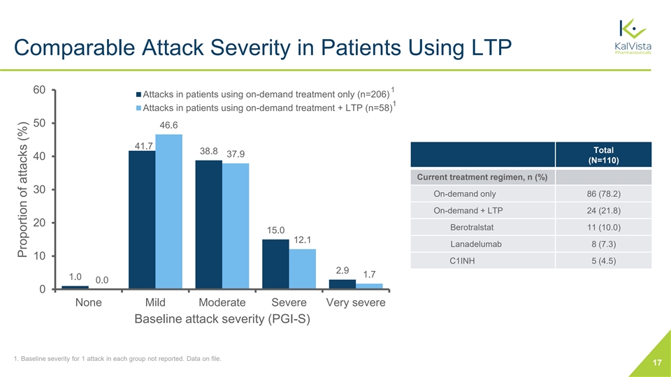 Comparable Attack Severity in Patients Using LTP 1 60 Attacks in patients using on-demand treatment only (n=206) 1 Attacks in patients using on-demand treatment + LTP (n=58) 50 46.6 41.7 Total 38.8 37.9 40 (N=110) Current treatment regimen, n (%) 30 On-demand only 86 (78.2) On-demand + LTP 24 (21.8) 20 Berotralstat 11 (10.0) 15.0 12.1 Lanadelumab 8 (7.3) 10 C1INH 5 (4.5) 2.9 1.7 1.0 0.0 0 None Mild Moderate Severe Very severe Baseline attack severity (PGI-S) 1. Baseline severity for 1 attack in each group not reported. Data on file. 17 Proportion of attacks (%)