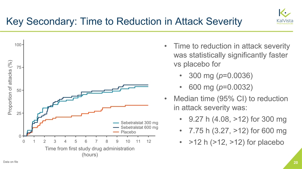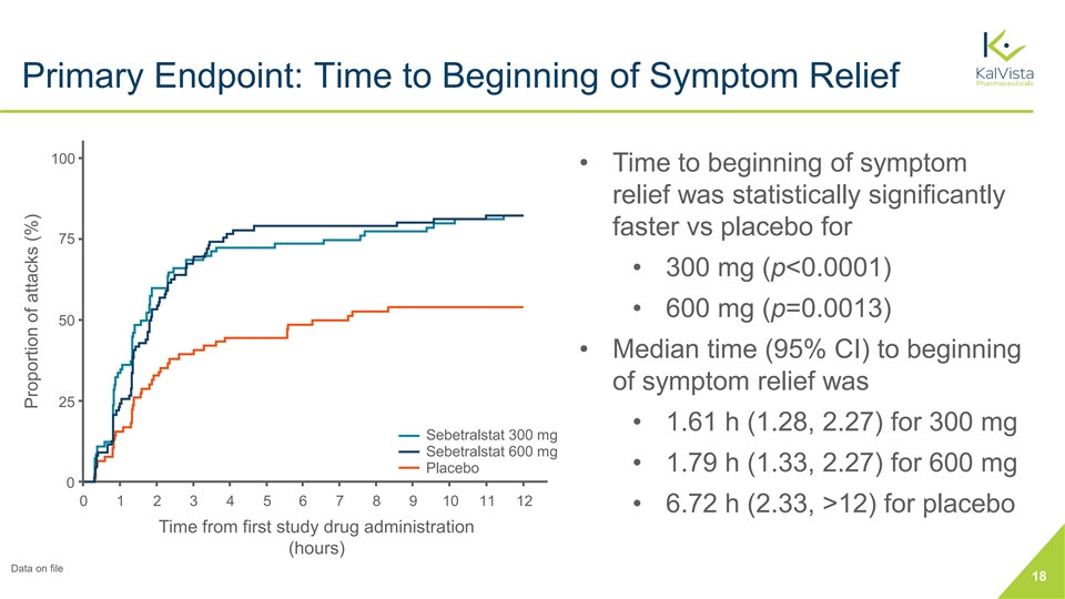 Primary Endpoint: Time to Beginning of Symptom Relief 100 • Time to beginning of symptom relief was statistically significantly faster vs placebo for 75 • 300 mg (p<0.0001) • 600 mg (p=0.0013) 50 • Median time (95% CI) to beginning of symptom relief was 25 • 1.61 h (1.28, 2.27) for 300 mg Sebetralstat 300 mg Sebetralstat 600 mg • 1.79 h (1.33, 2.27) for 600 mg Placebo 0 0 1 2 3 4 5 6 7 8 9 10 11 12 • 6.72 h (2.33, >12) for placebo Time from first study drug administration (hours) Data on file 18 Proportion of attacks (%)