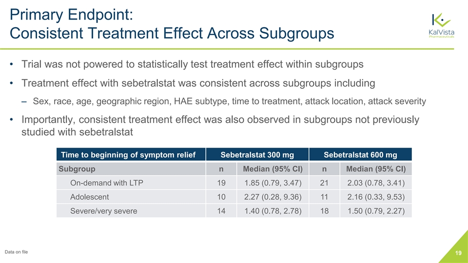 Primary Endpoint: Consistent Treatment Effect Across Subgroups • Trial was not powered to statistically test treatment effect within subgroups • Treatment effect with sebetralstat was consistent across subgroups including ‒ Sex, race, age, geographic region, HAE subtype, time to treatment, attack location, attack severity • Importantly, consistent treatment effect was also observed in subgroups not previously studied with sebetralstat Time to beginning of symptom relief Sebetralstat 300 mg Sebetralstat 600 mg Subgroup n Median (95% CI) n Median (95% CI) On-demand with LTP 19 1.85 (0.79, 3.47) 21 2.03 (0.78, 3.41) Adolescent 10 2.27 (0.28, 9.36) 11 2.16 (0.33, 9.53) Severe/very severe 14 1.40 (0.78, 2.78) 18 1.50 (0.79, 2.27) Data on file 19