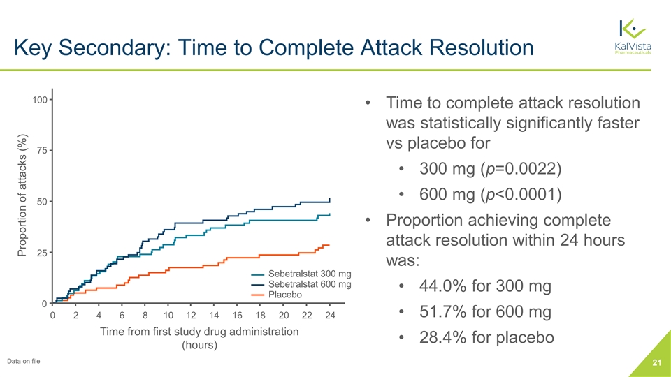 Key Secondary: Time to Reduction in Attack Severity 100 • Time to reduction in attack severity was statistically significantly faster vs placebo for 75 • 300 mg (p=0.0036) • 600 mg (p=0.0032) 50 • Median time (95% CI) to reduction in attack severity was: 25 • 9.27 h (4.08, >12) for 300 mg Sebetralstat 300 mg Sebetralstat 600 mg • 7.75 h (3.27, >12) for 600 mg Placebo 0 0 1 2 3 4 5 6 7 8 9 10 11 12 • >12 h (>12, >12) for placebo Time from first study drug administration (hours) Data on file 20 Proportion of attacks (%)