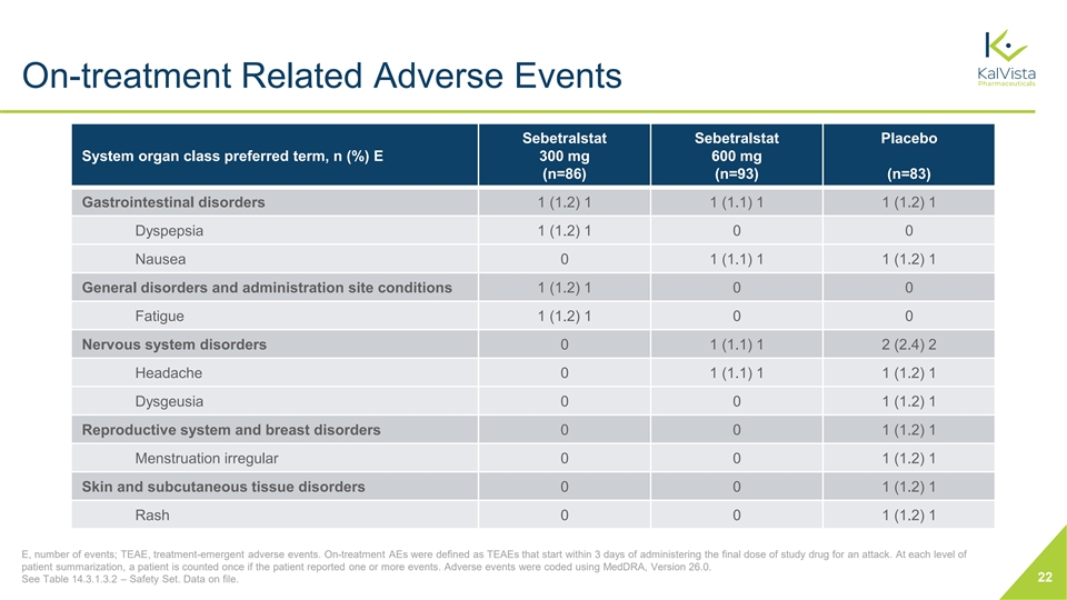 On-treatment Related Adverse Events Sebetralstat Sebetralstat Placebo System organ class preferred term, n (%) E 300 mg 600 mg (n=86) (n=93) (n=83) Gastrointestinal disorders 1 (1.2) 1 1 (1.1) 1 1 (1.2) 1 Dyspepsia 1 (1.2) 1 0 0 Nausea 0 1 (1.1) 1 1 (1.2) 1 General disorders and administration site conditions 1 (1.2) 1 0 0 Fatigue 1 (1.2) 1 0 0 Nervous system disorders 0 1 (1.1) 1 2 (2.4) 2 Headache 0 1 (1.1) 1 1 (1.2) 1 Dysgeusia 0 0 1 (1.2) 1 Reproductive system and breast disorders 0 0 1 (1.2) 1 Menstruation irregular 0 0 1 (1.2) 1 Skin and subcutaneous tissue disorders 0 0 1 (1.2) 1 Rash 0 0 1 (1.2) 1 E, number of events; TEAE, treatment-emergent adverse events. On-treatment AEs were defined as TEAEs that start within 3 days of administering the final dose of study drug for an attack. At each level of patient summarization, a patient is counted once if the patient reported one or more events. Adverse events were coded using MedDRA, Version 26.0. 22 See Table 14.3.1.3.2 – Safety Set. Data on file.